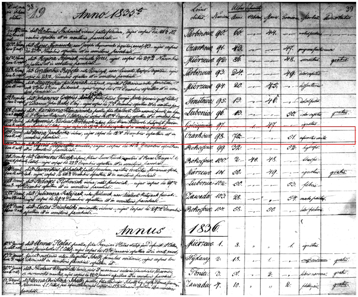 Description: Death of Anna Jankoska, widow, buried 12 December in parochial