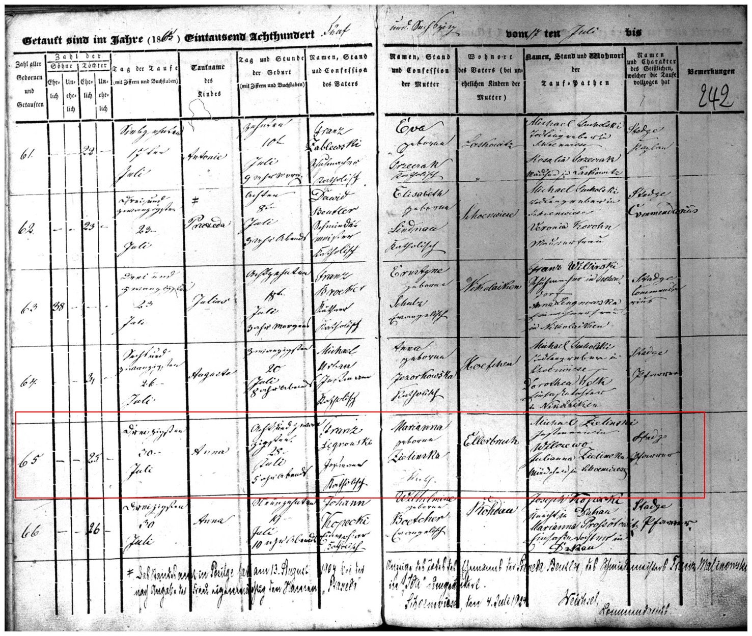 Record: 65th baptism for Schonweise Parish in 1865, 25th female