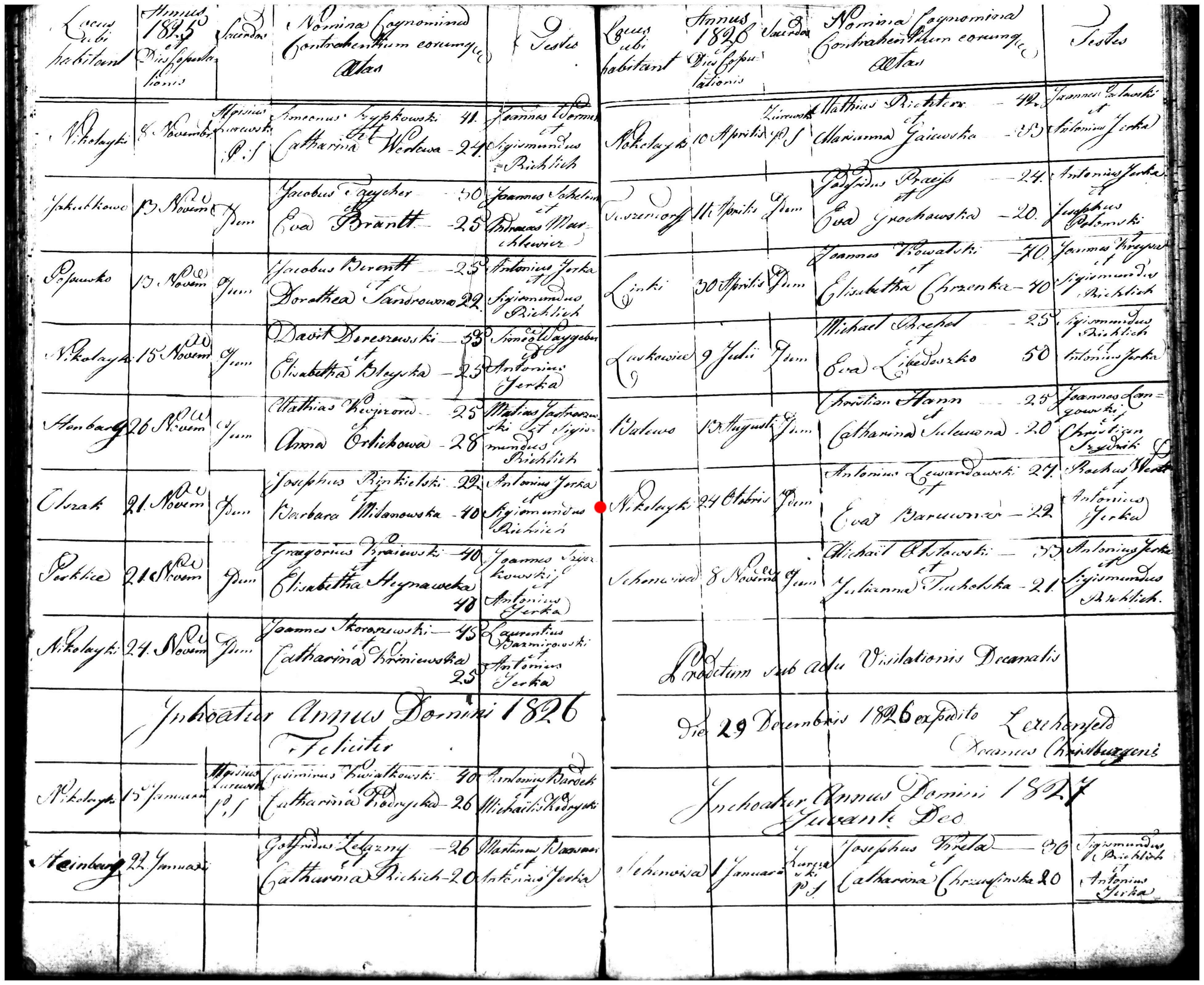 Translation: location: Nikolaiken date: 24 October 1826 husband: Antonius Lewandowski husband age: 27 wife: Eva Barkowna (misspelled) wife age: 22 witnesses: Rochus Werth and Antonius Gerka