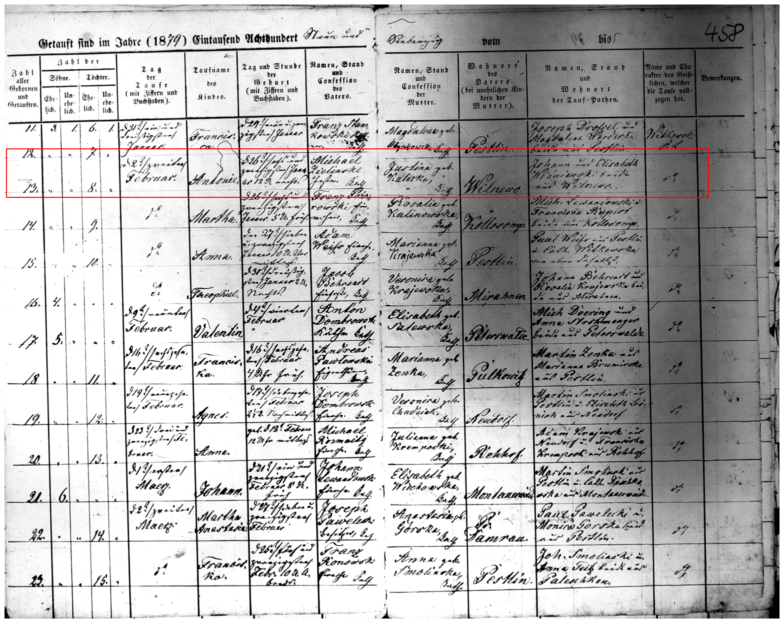 Record: 13th baptism for Pestlin Parish in 1879, 8th female, legitimate