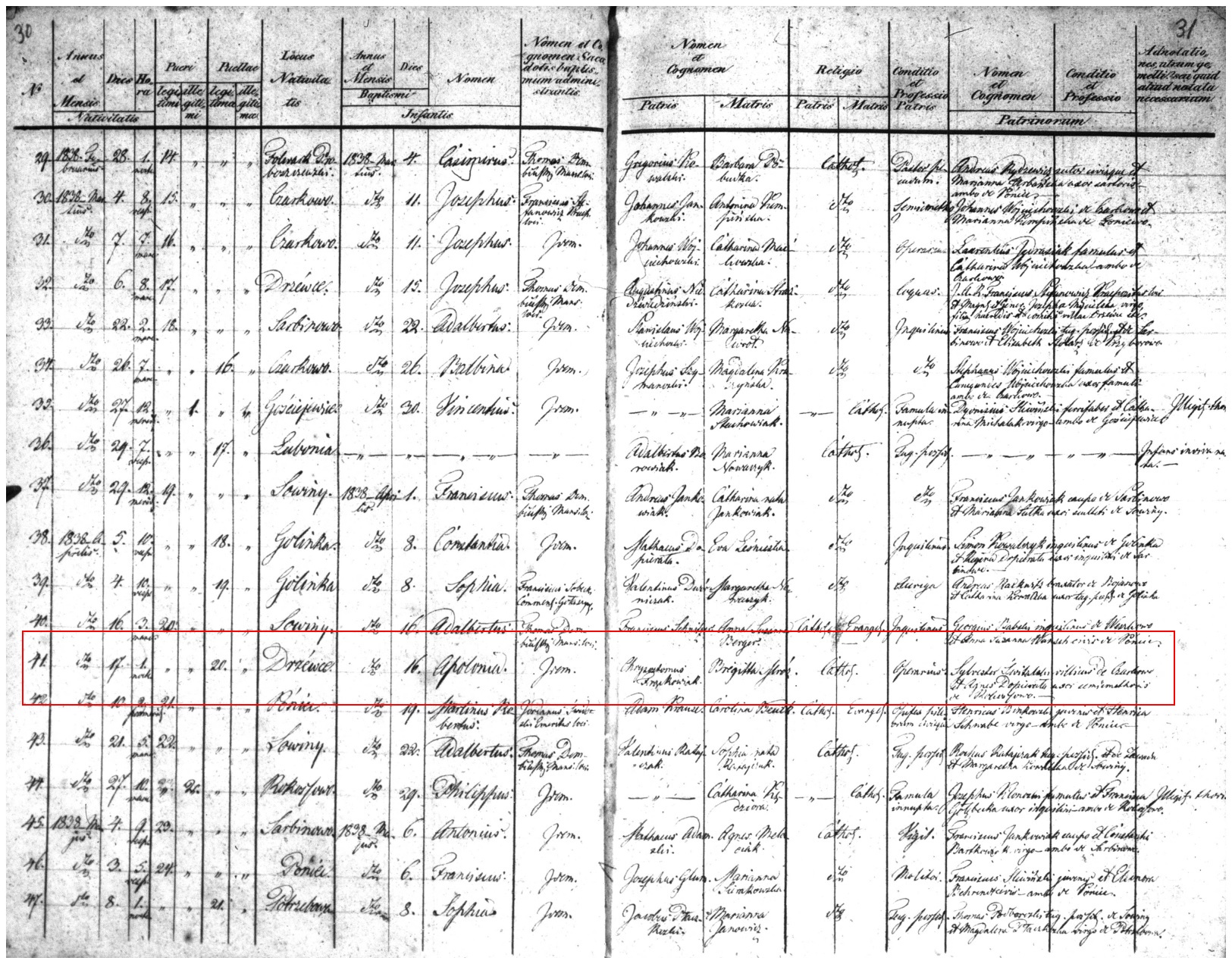Record: 41st baptism for Poniec Parish in 1838, 20th female, legitimate