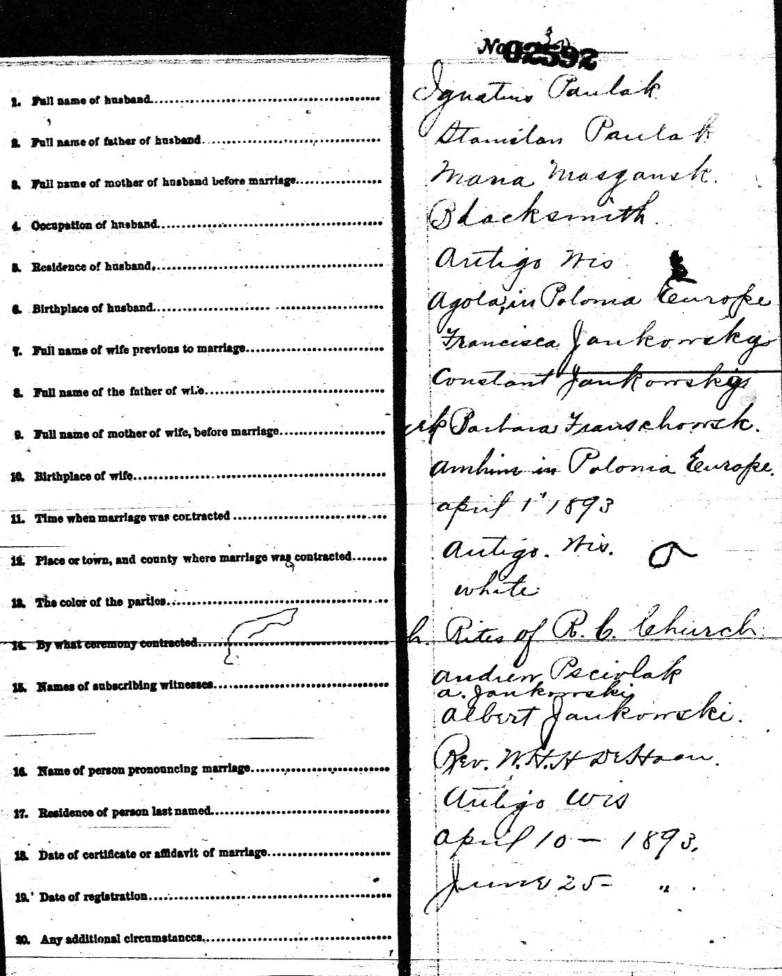 | Place of Marriage | Antigo, WI |