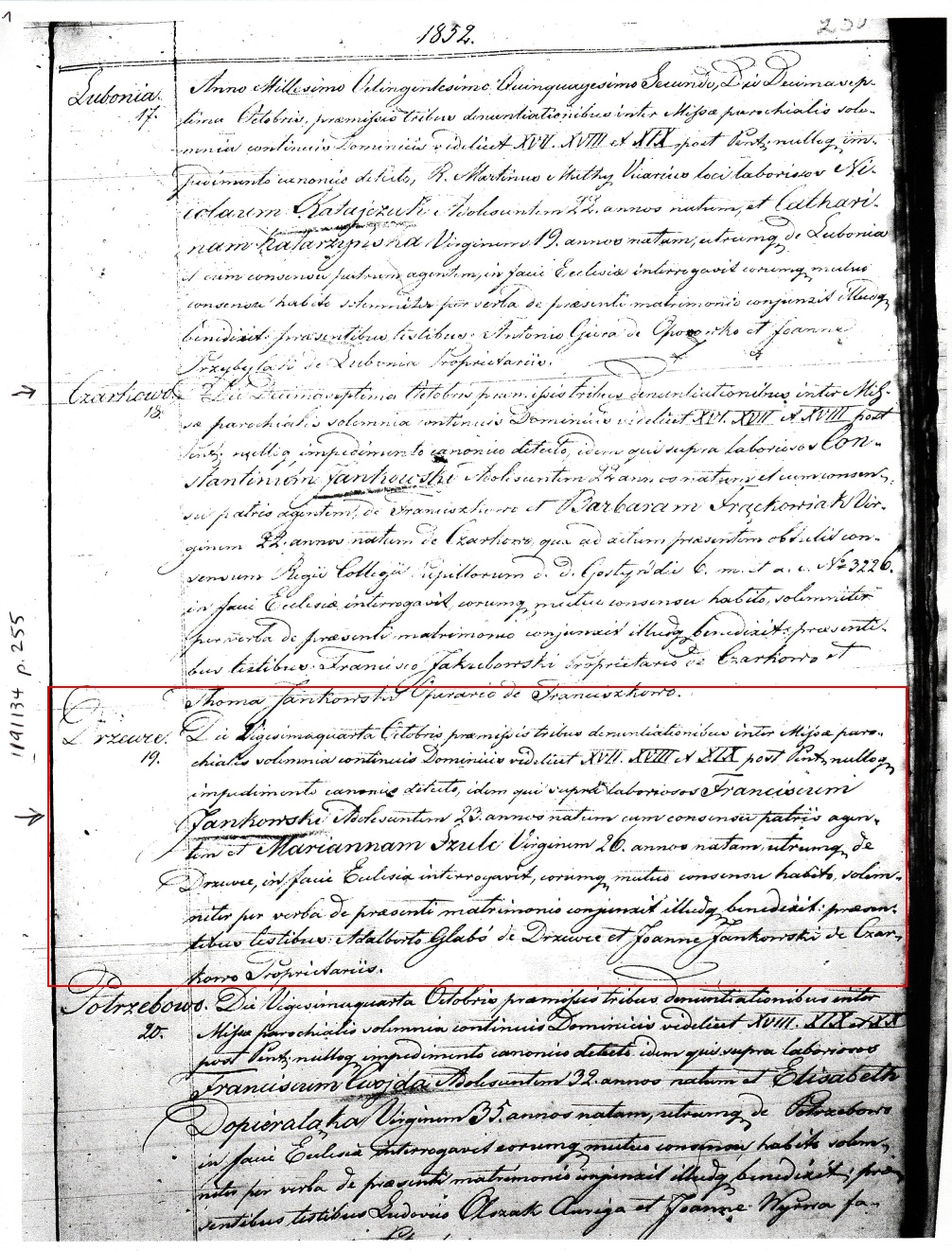 Record: 19th marriage for Poniec Parish in 1852