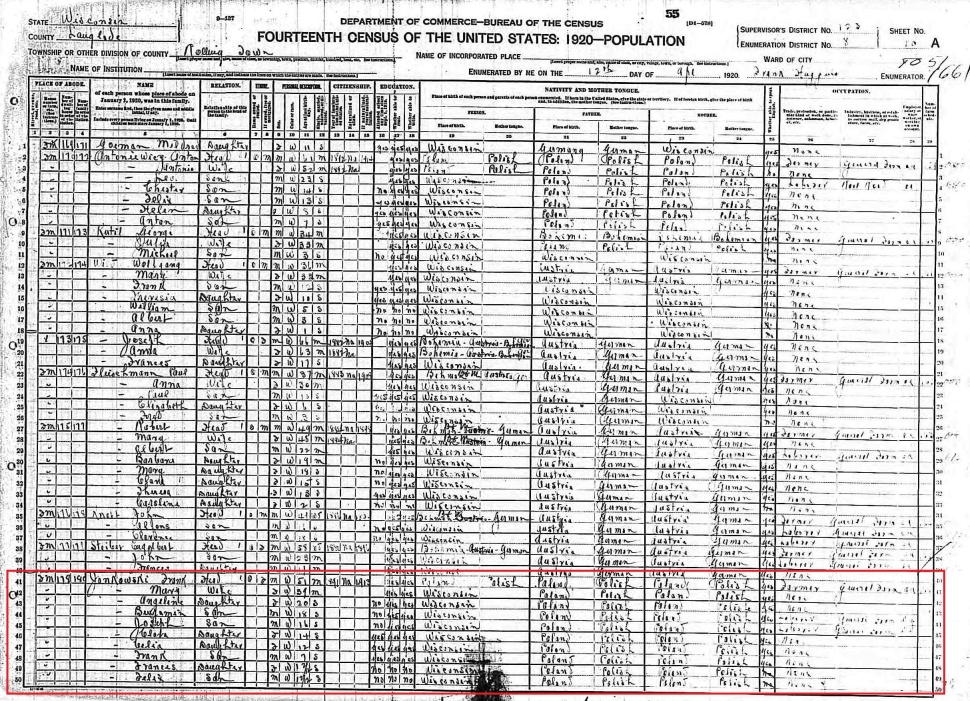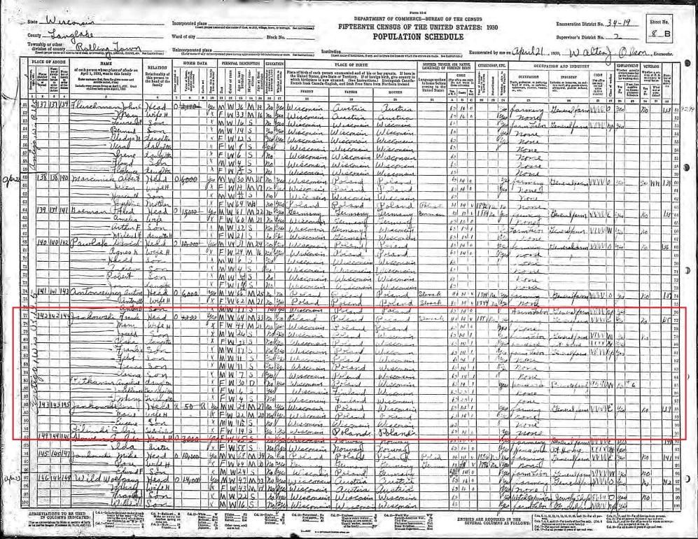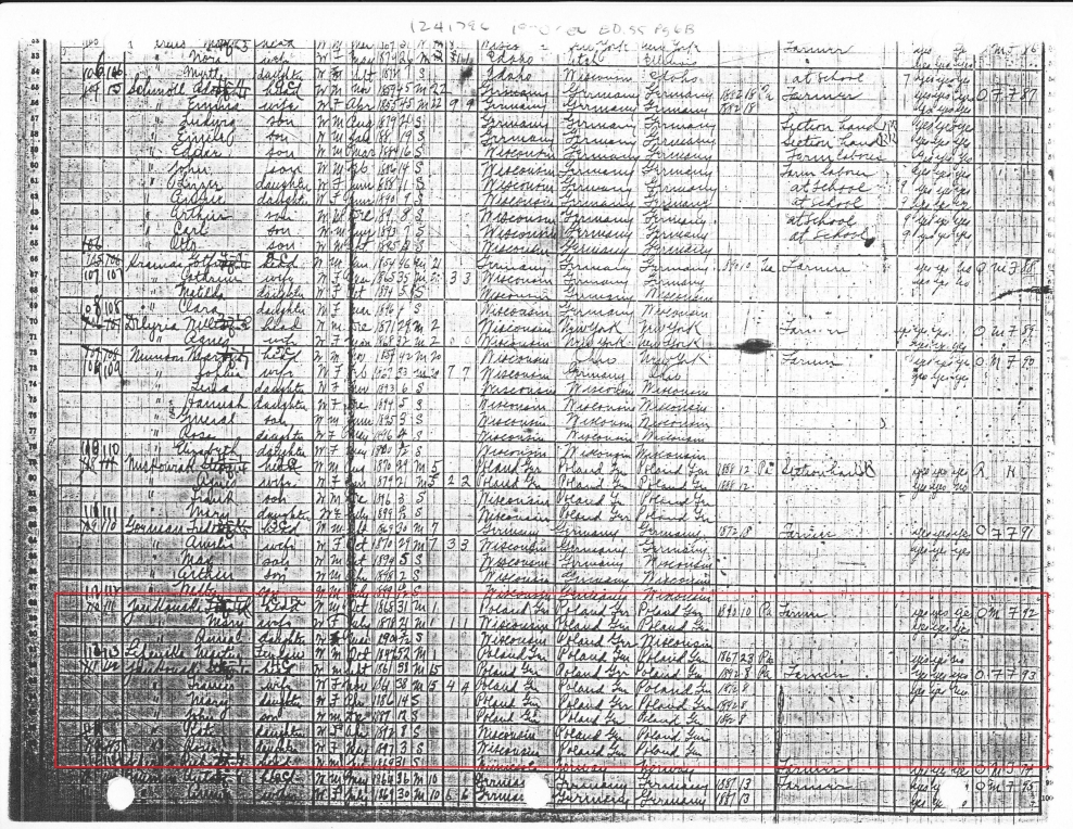 It is unknown how Frank and Mary met, but they established a farm in Rolling township near Antigo. I am uncertain as to whether this farm was part of the original Jankowski homestead, or separate from it. The couple had 9 children, plus a set of stillborn twins. Many of the dates of these children are unknown at this time.