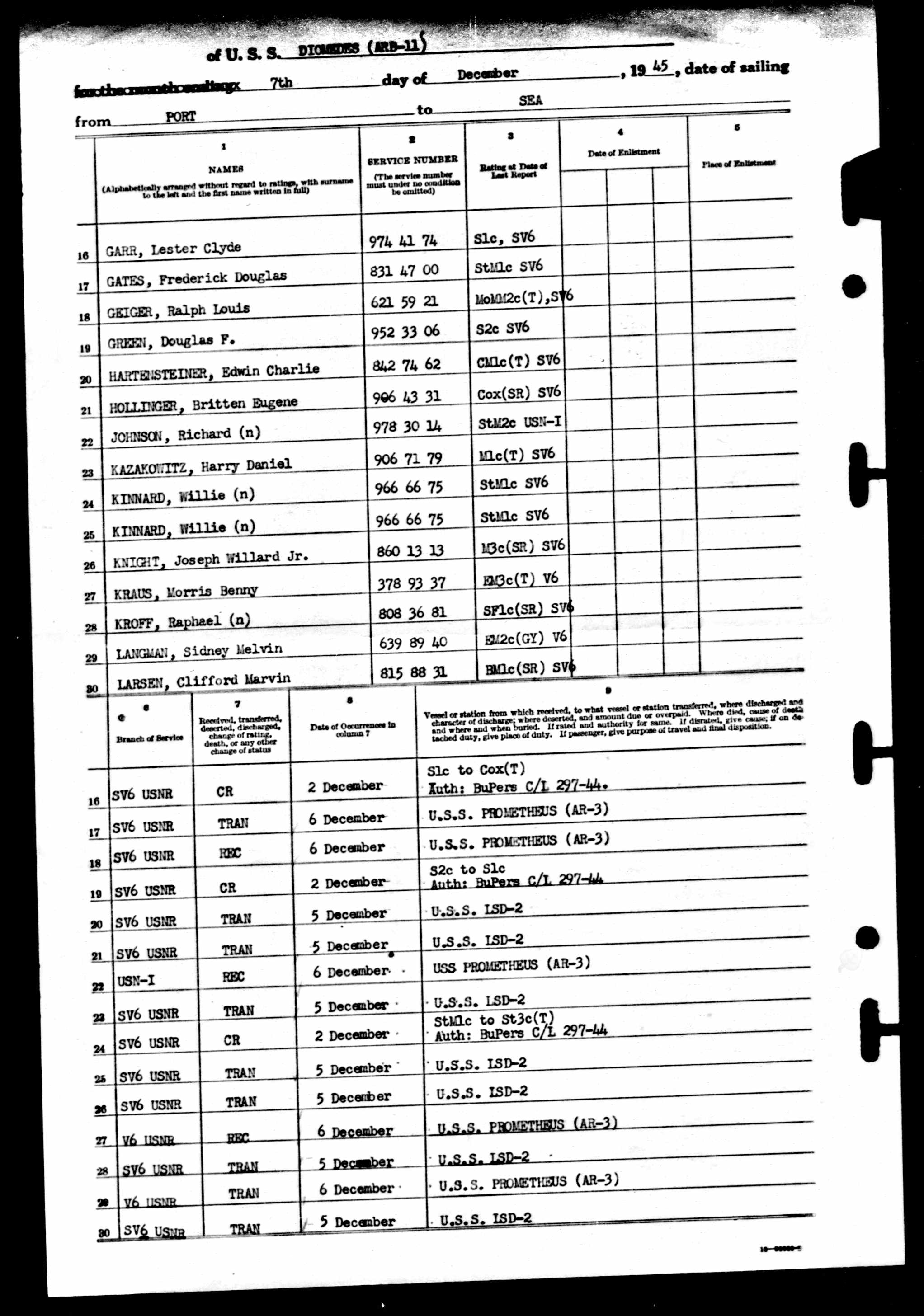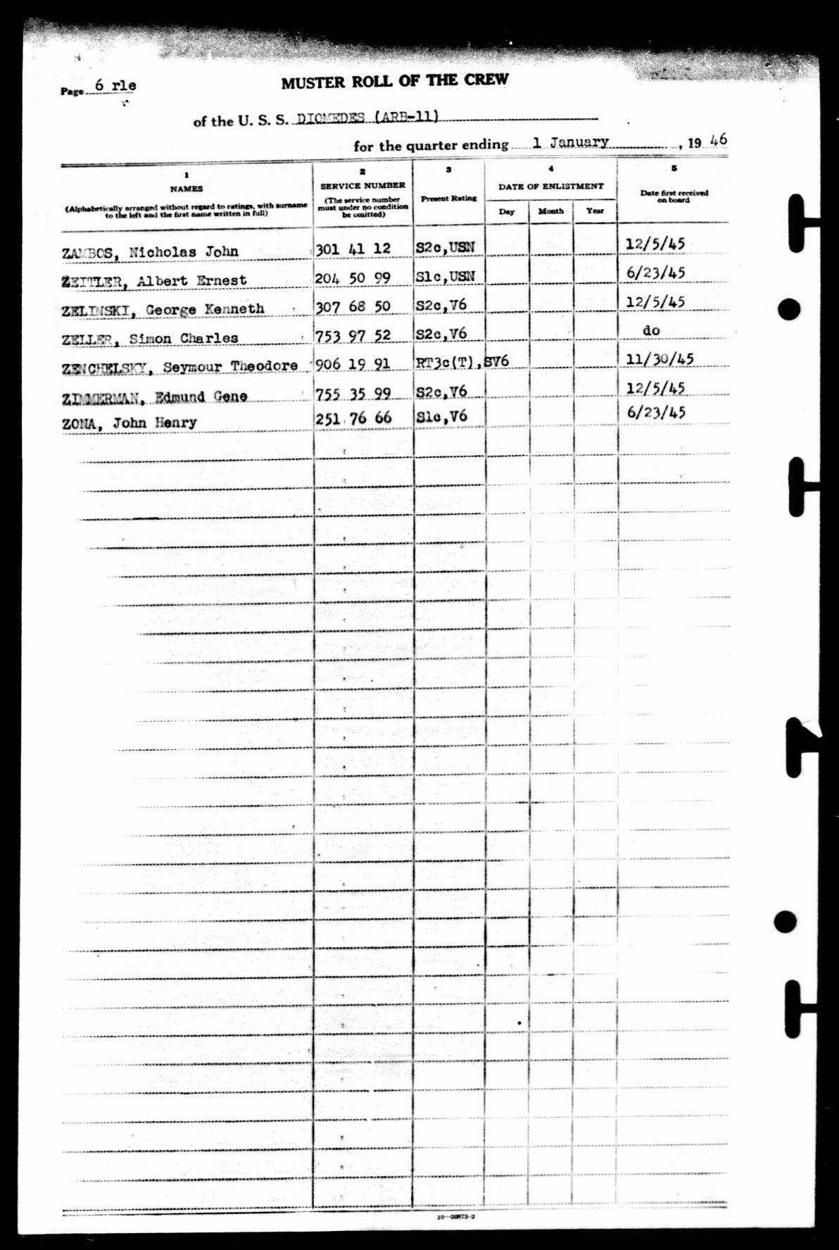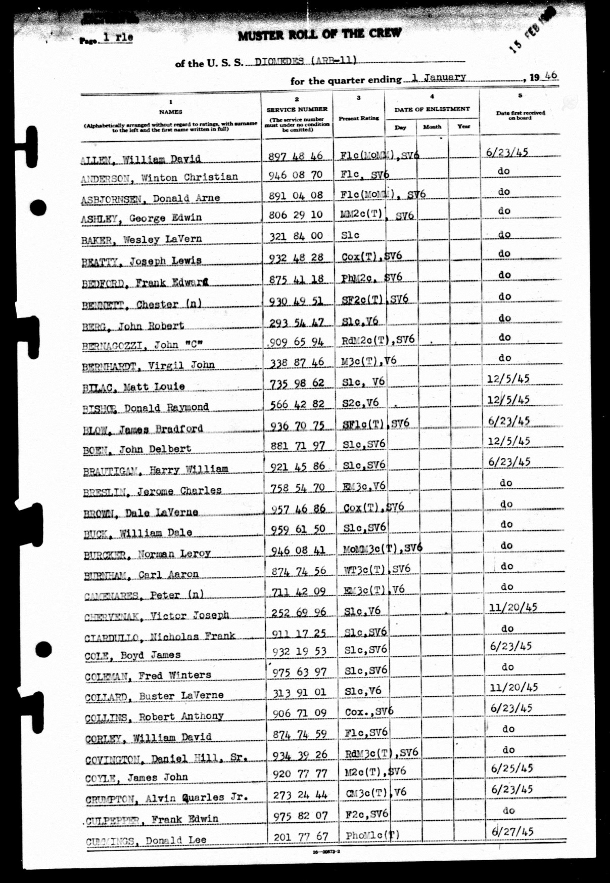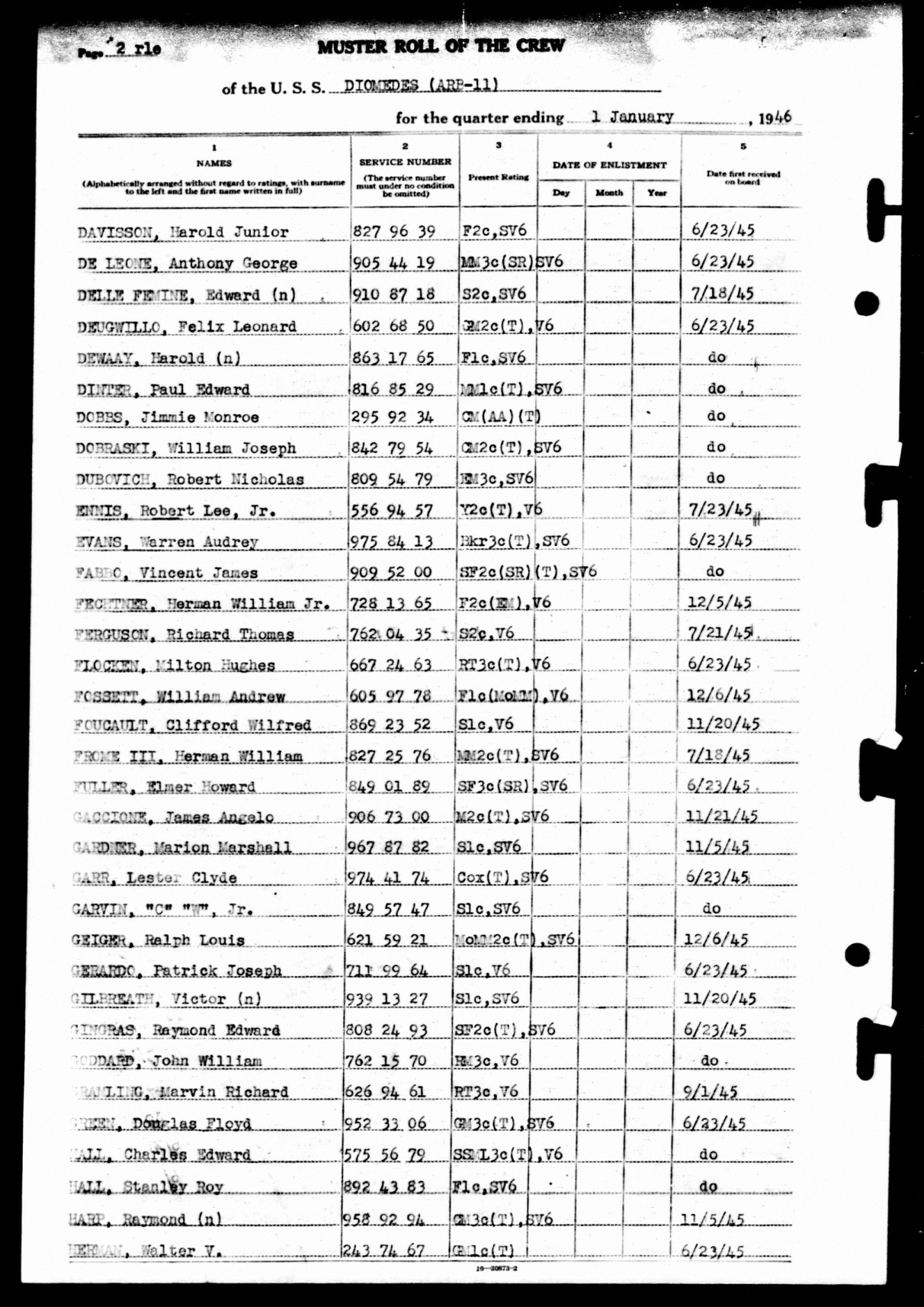Muster Rolls dated December 7, 1945 - U.S.S. Diomedes