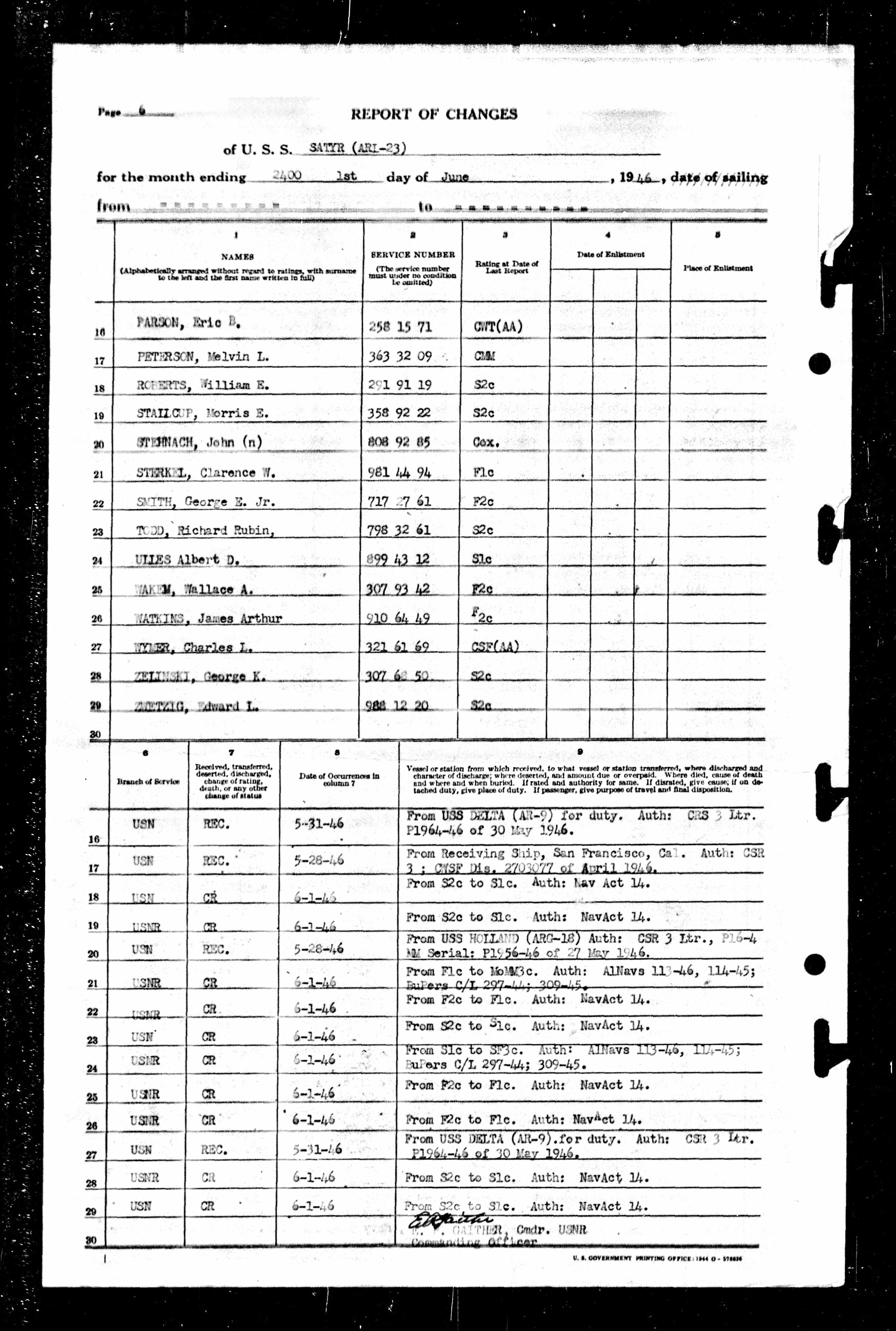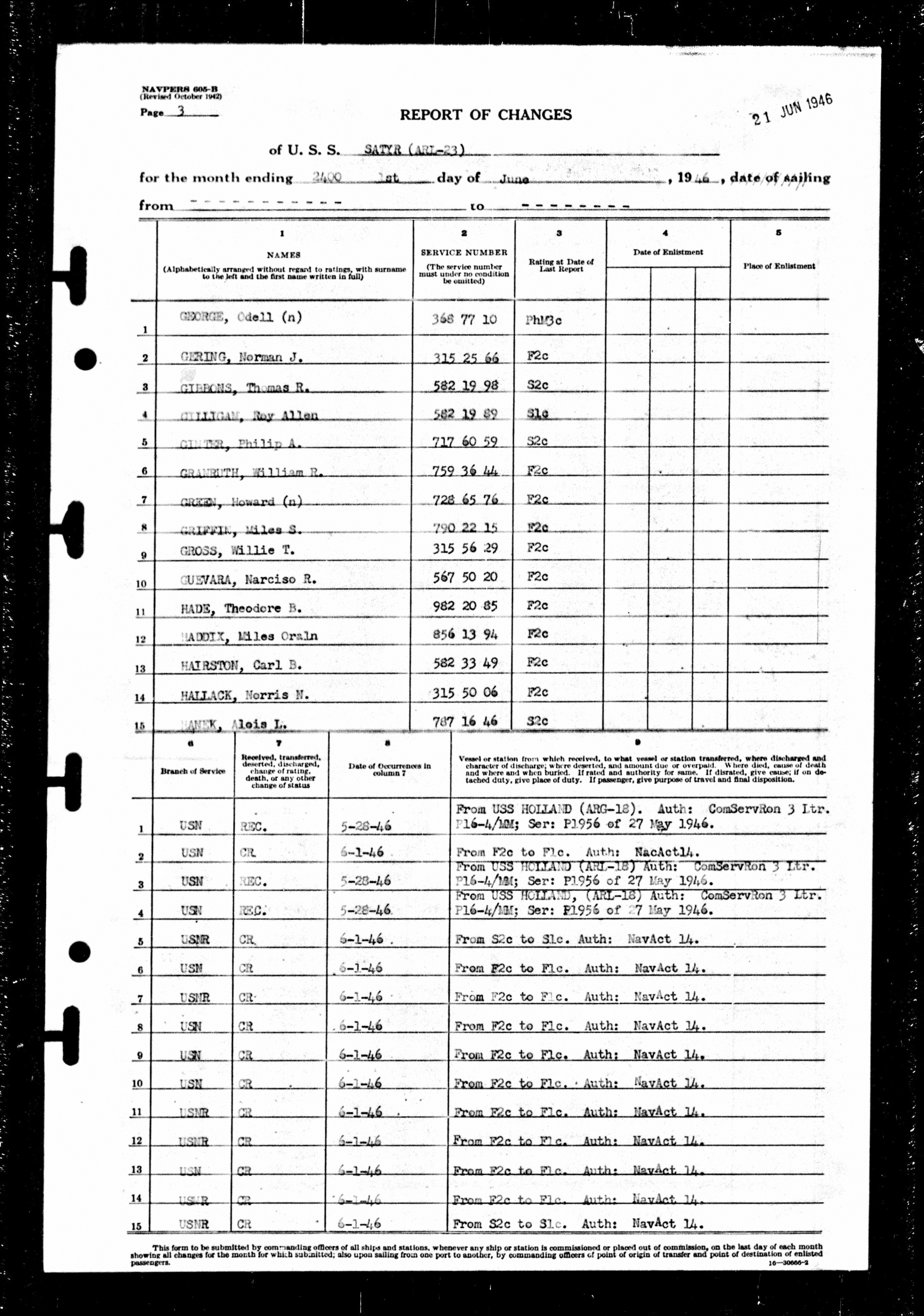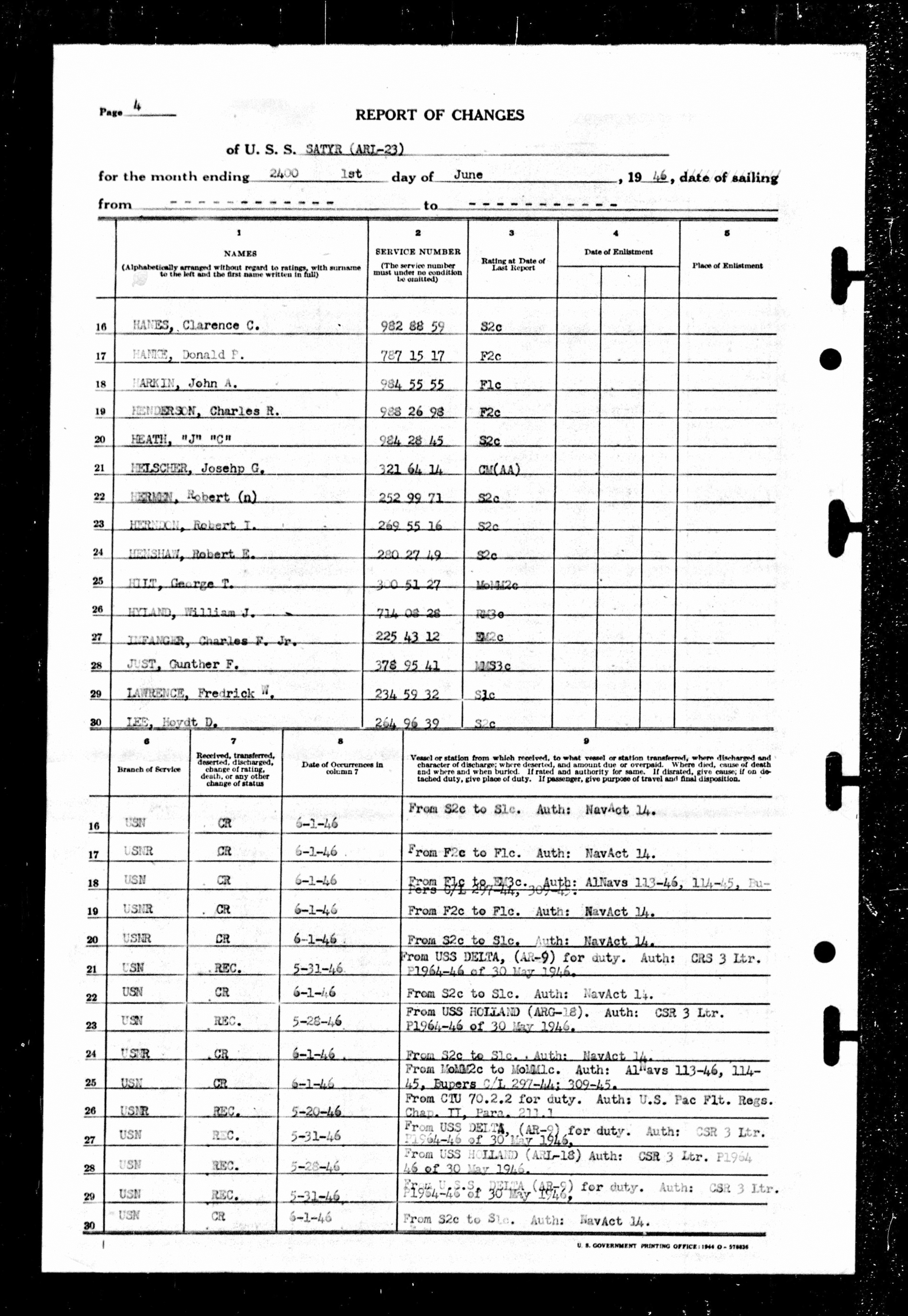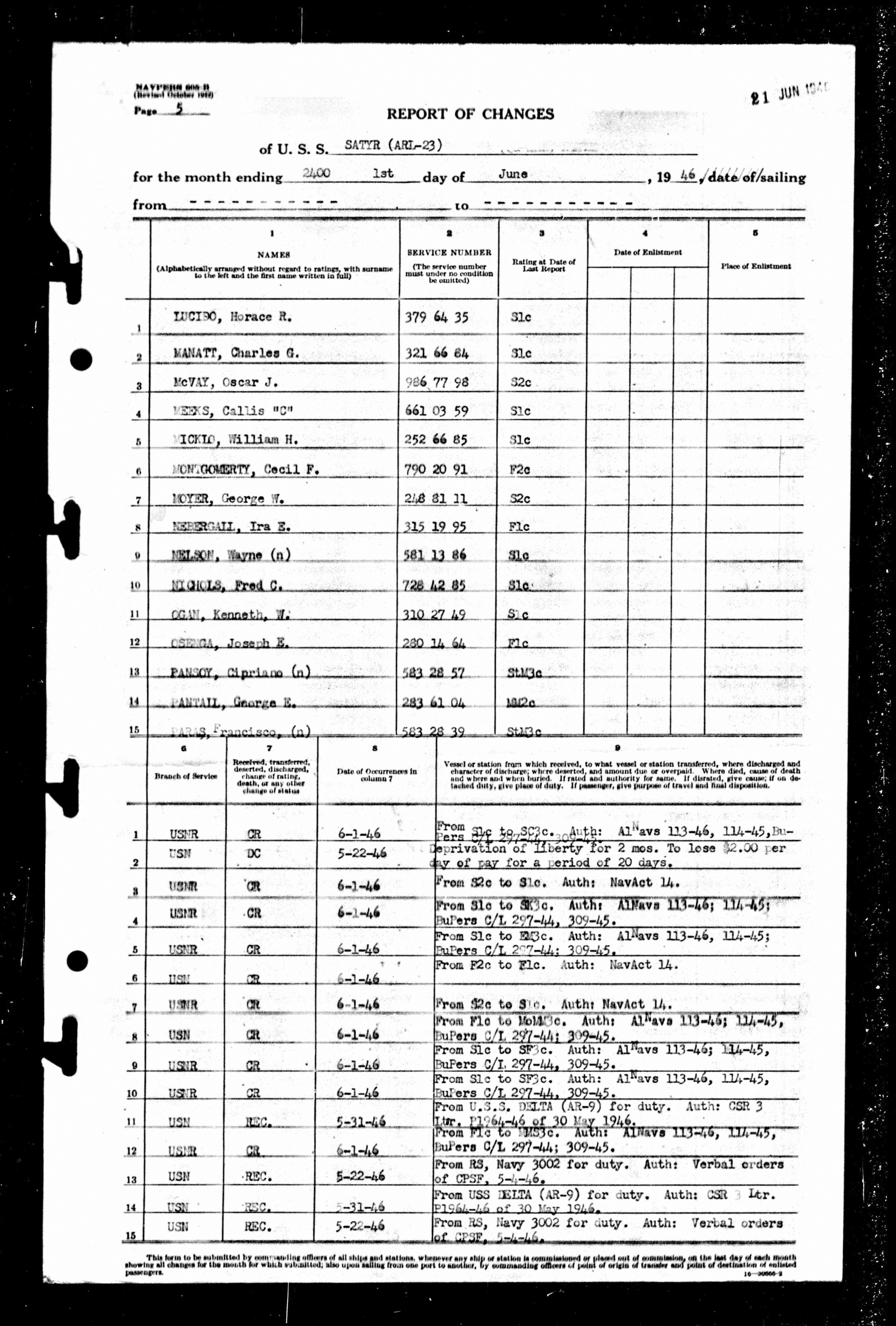 Muster Rolls dated June 1, 1946 - U.S.S. Satyr