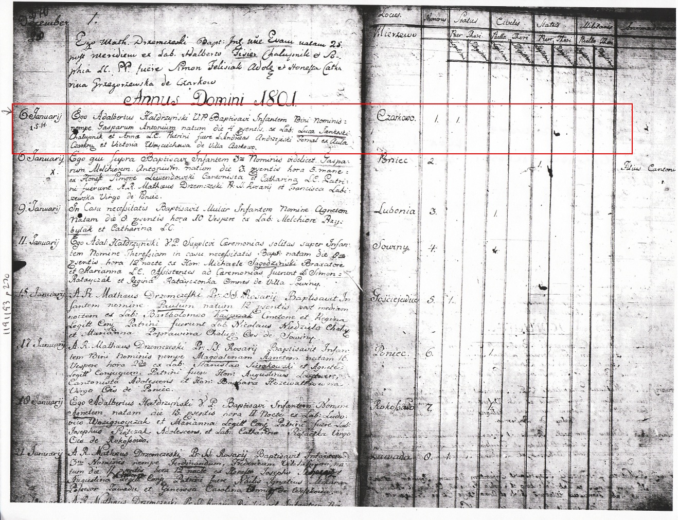 Record: 1st baptism for Poniec Parish in 1801, 1st male