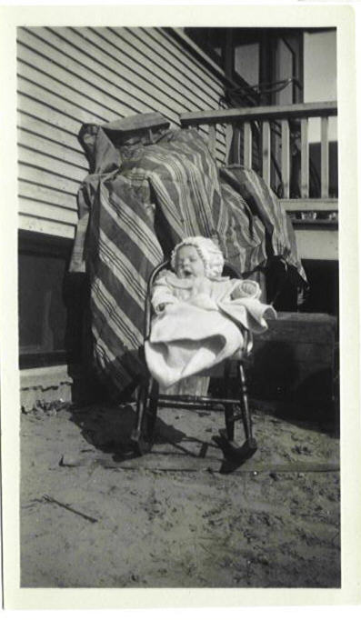 Janie in a rocking chair in the back yard of their home at 635 5th