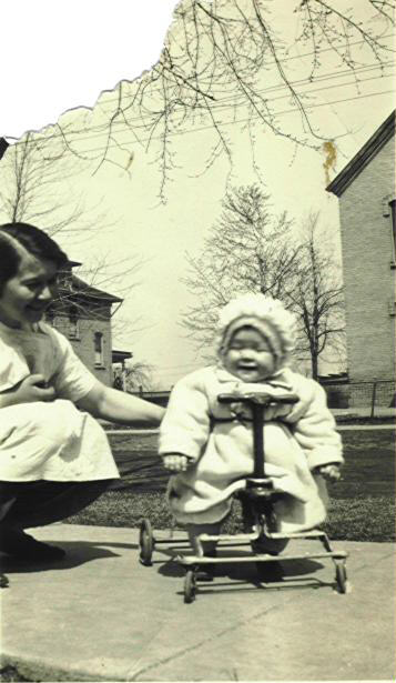 Lena with Janie on her bicycle! This was taken on the sidewalk in front