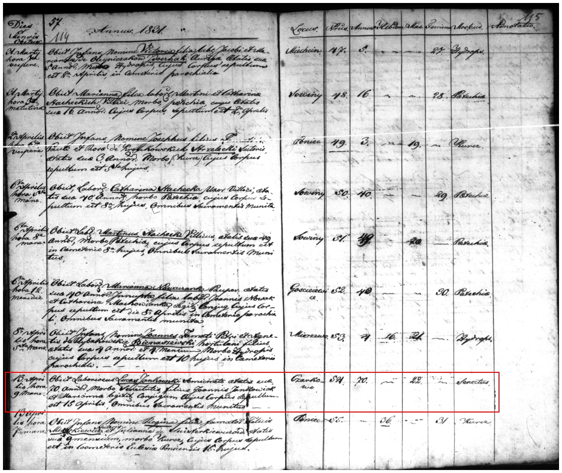 Description: Death of peasant Lucas Jankowski, tenant farmer aged 70 years, of