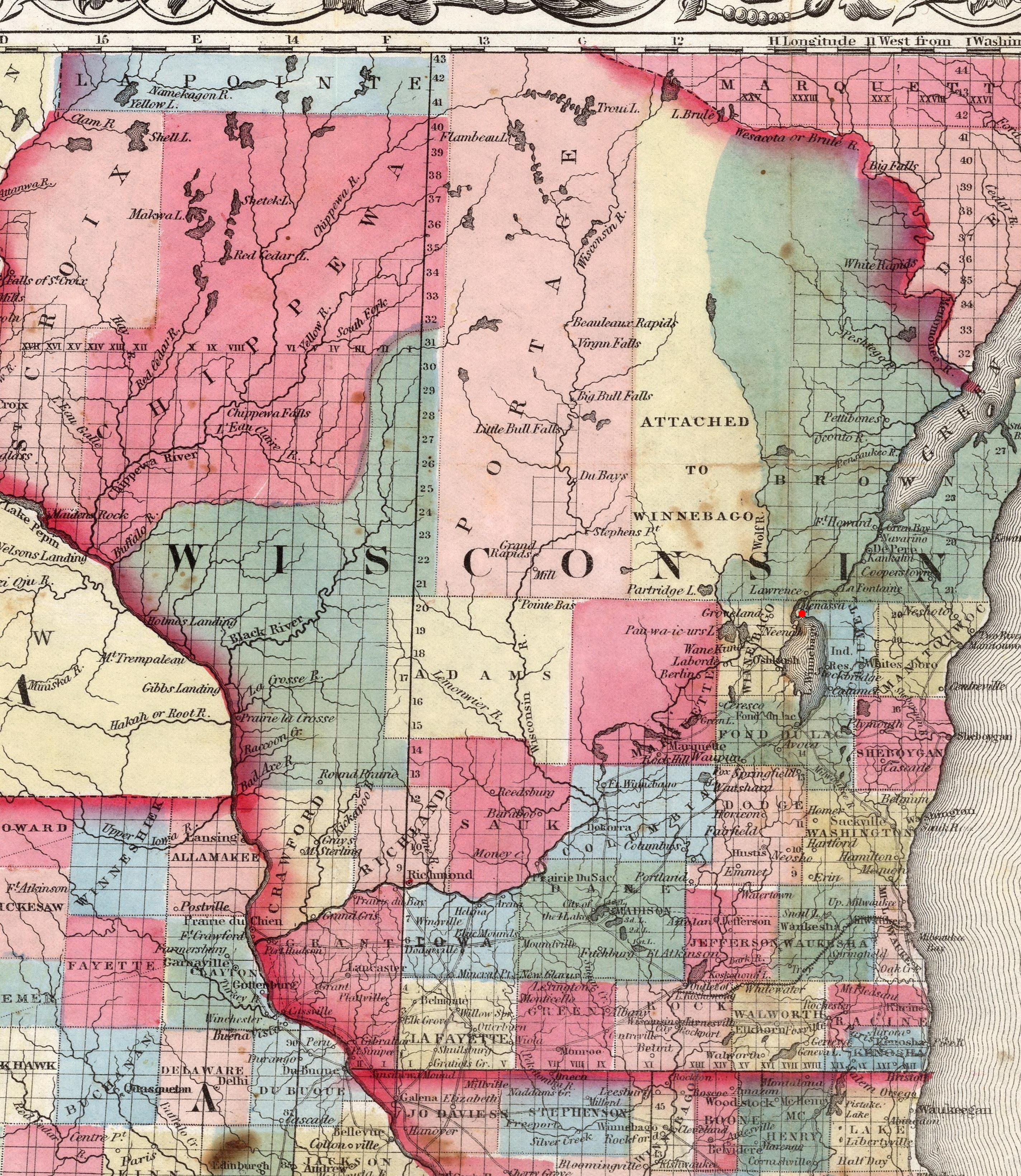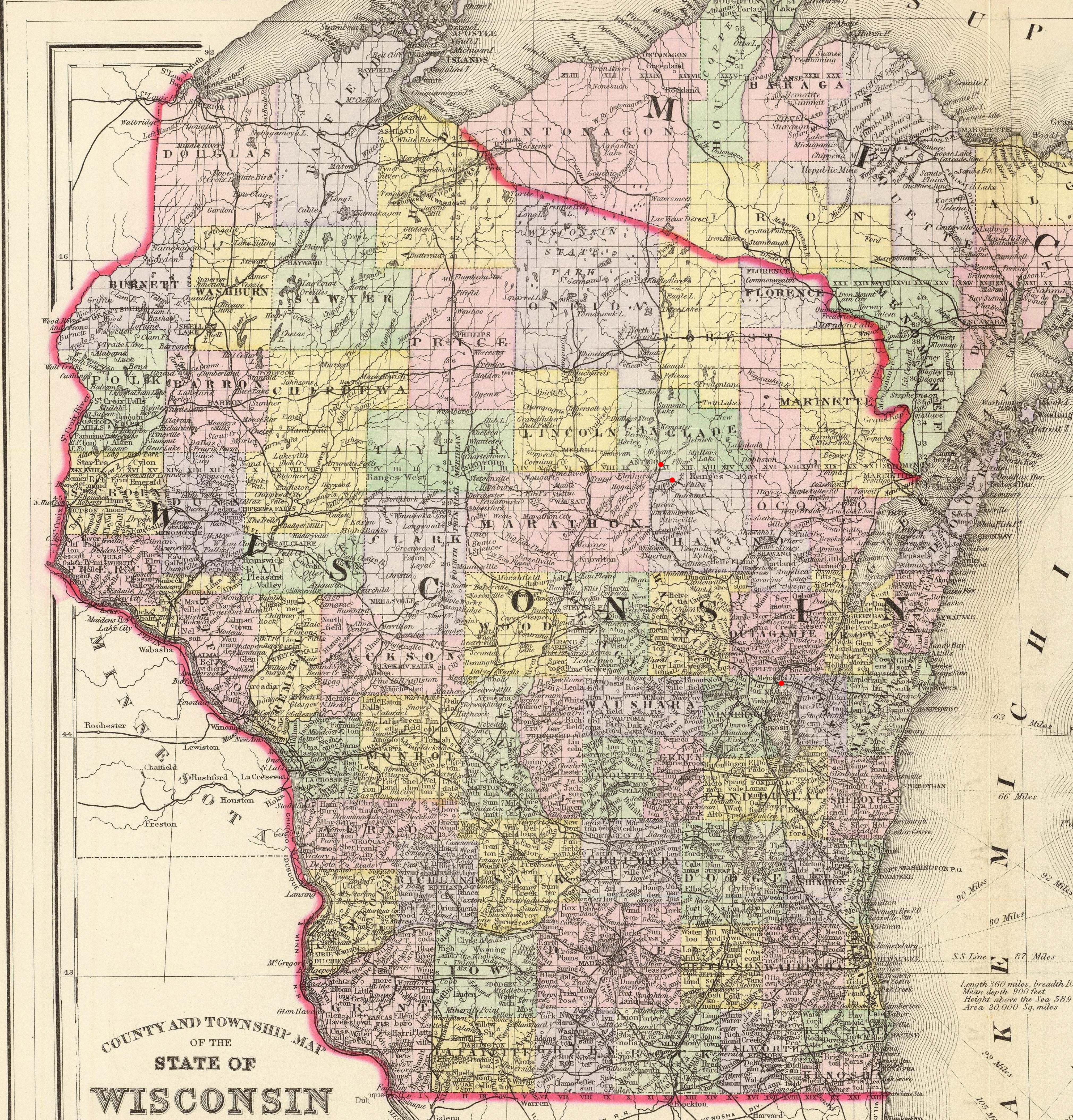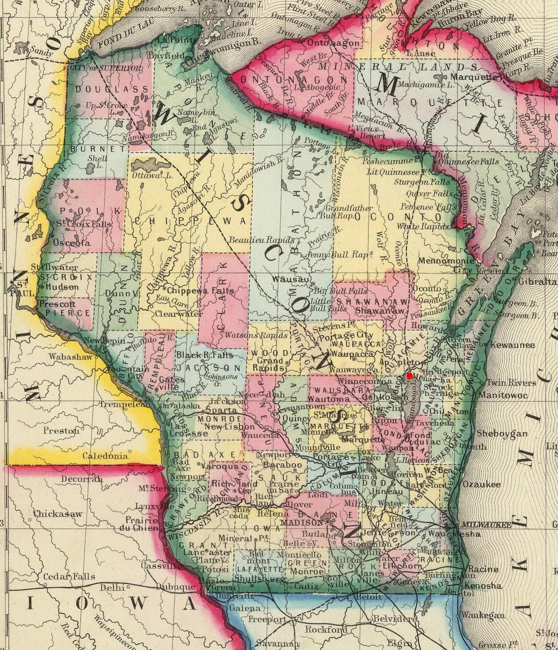 Wisconsin, USA 1851 Wisconsin from larger map, 1st mention of Menasha 1860 Wisconsin Menasha 1870 Wisconsin Menasha 1880 Wisconsin Menasha 1881 Wisconsin Menasha, Antigo, 1st mention of Antigo and Langlade County 1886 Wisconsin Central Line rail routes thru Wisconsin 1890 Wisconsin Menasha, Antigo, Rolling, 1st mention of Rolling (in Shawano County) |