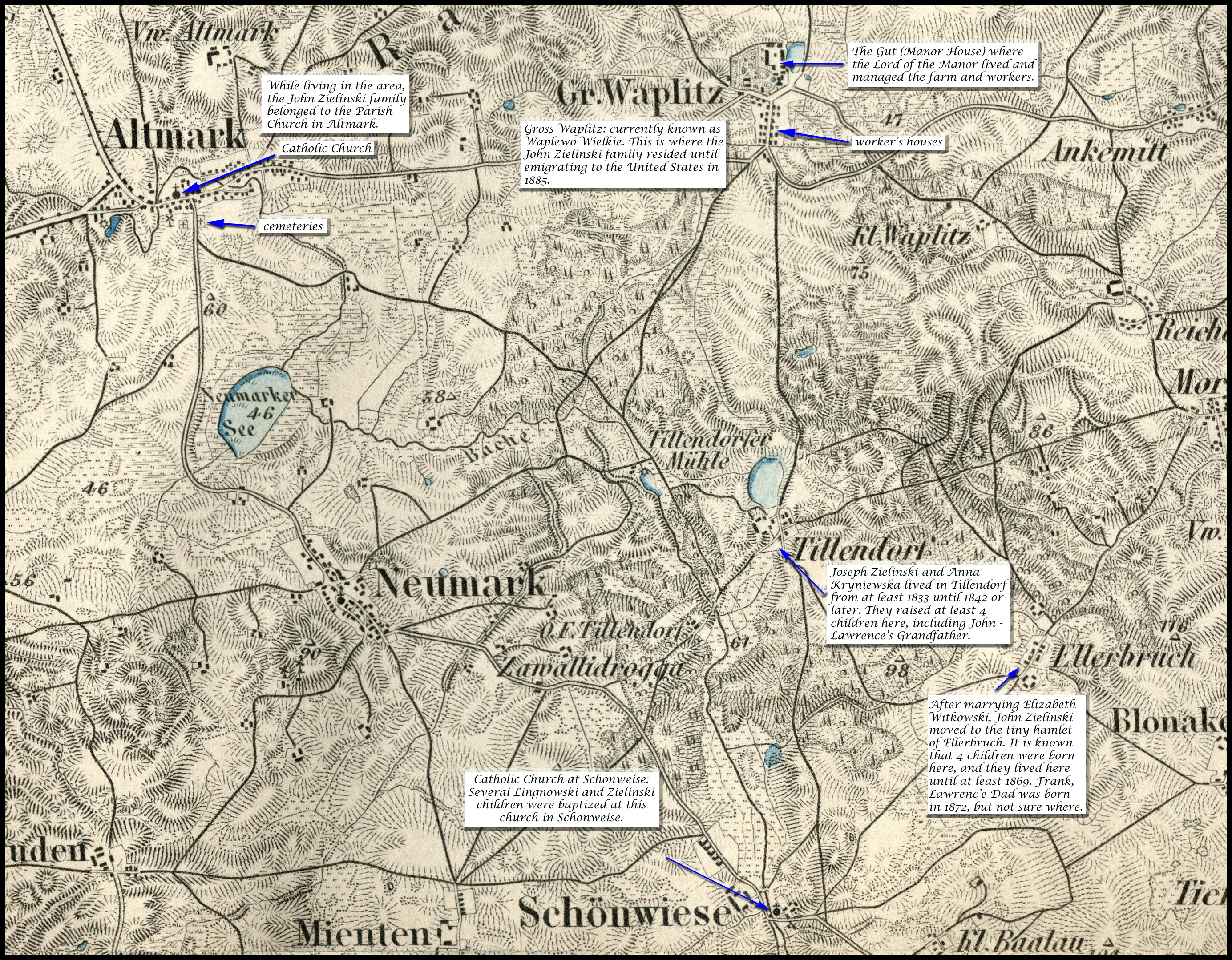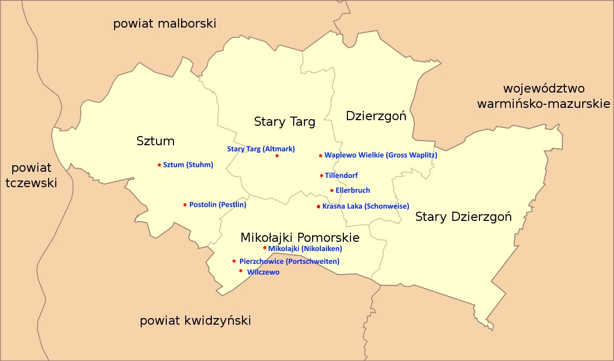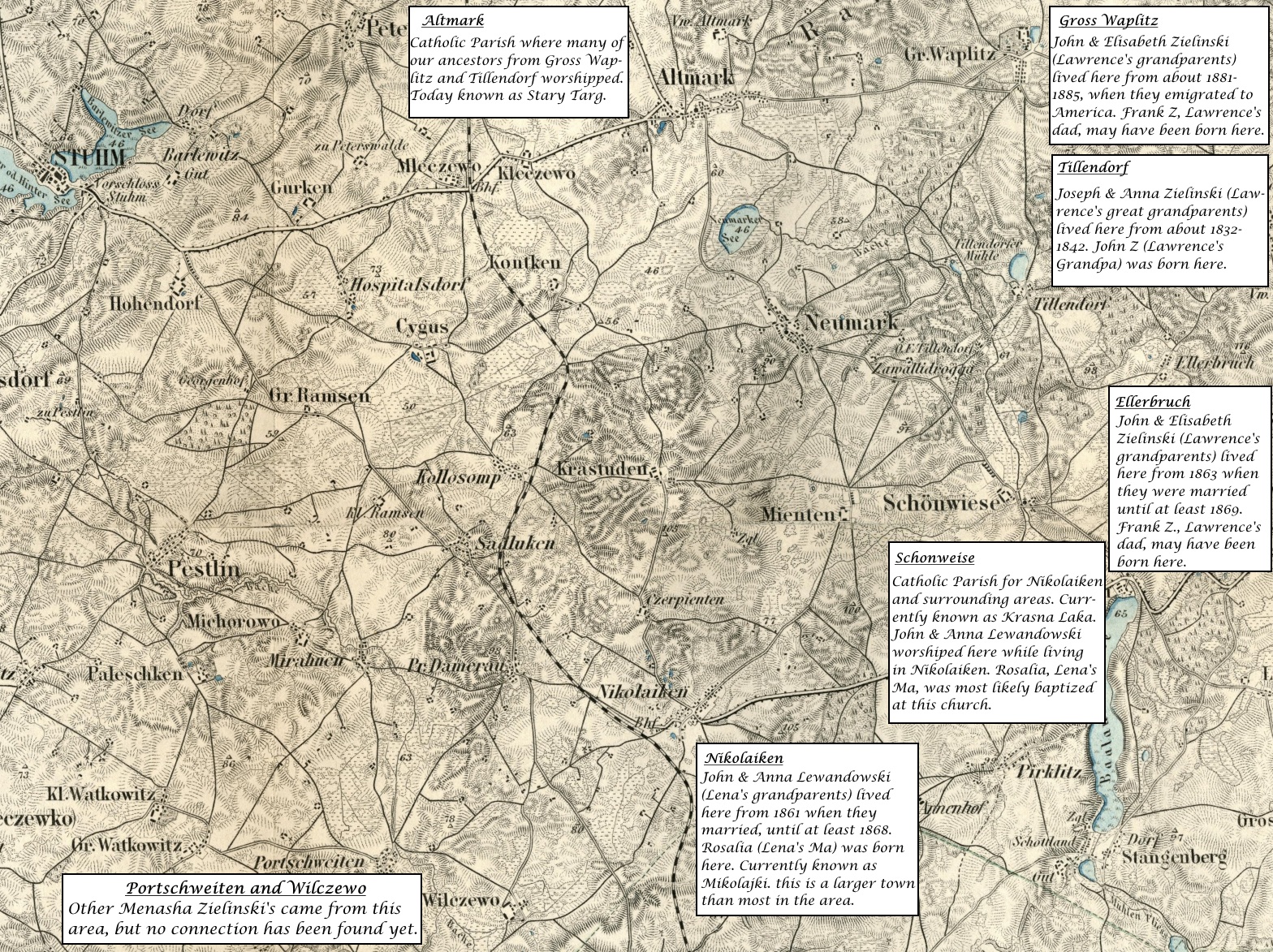 Voivodeship, Poland (Zielinski/Lewandowski) 1873 West Prussia (cropped from larger map, annotated) 1877 Altmark (Stary Targ) close-up view 1893 Stuhm area (Sztum) large map, important towns marked 1893 Stuhm area zoomed in, annotated with info related to Zielinski/Lewandowski ancestors 1893 Gross Waplitz area (Waplewo Wielkie) annotated with info related to John and Elizabeth Zielinski 1893 Gross Waplitz close-up view, annotated 1893 Ellerbruch (Olszak or Olszowka) close-up view 1893 Nikolaiken (Mikolajki Pomorskie) close-up view 1893 Pestlin (Postolin) close-up view 1893 Portschweiten (Pierzchowice) close-up view 1893 Schonweise (Krasna Laka) close-up view 1893 Tillendorf (Tulice) close-up view 1893 Wilczewo (same) close-up view 1900 Stuhm area with Catholic Church Parishes marked 1999 Sztum Powiat simple map with villages marked 2013 Pomerania Powiats Sztum in relation to Pomerania |