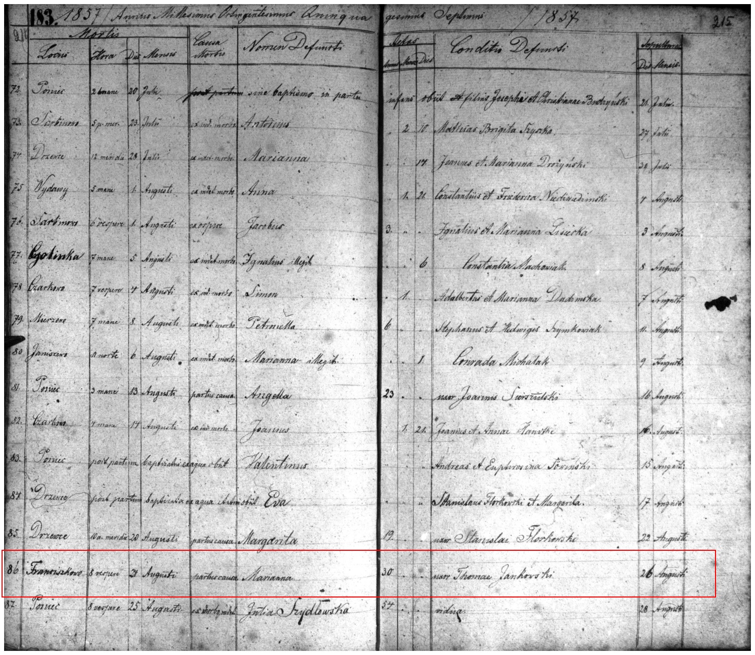 Record Number: 86th death reported for Poniec Parish in 1857