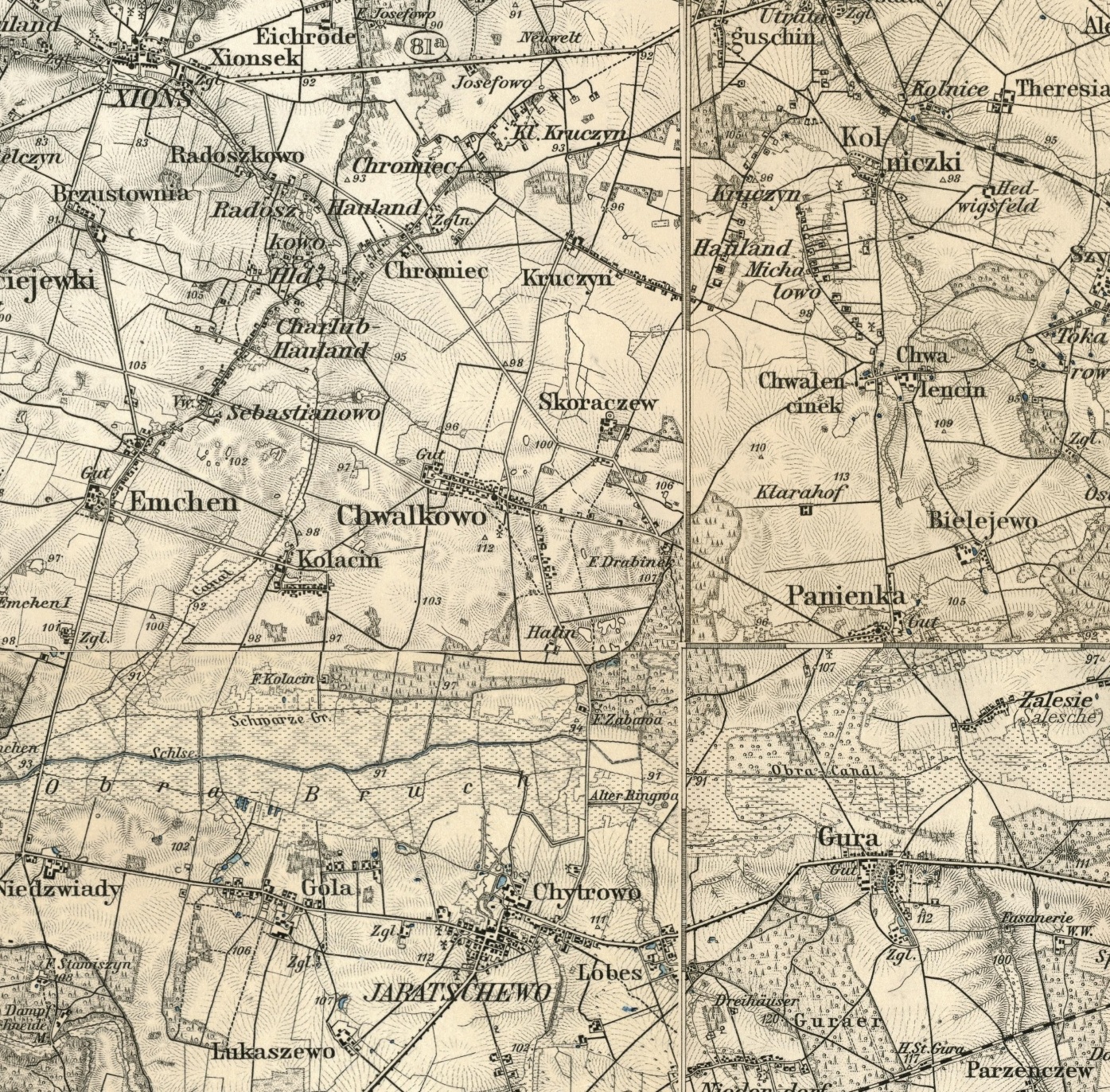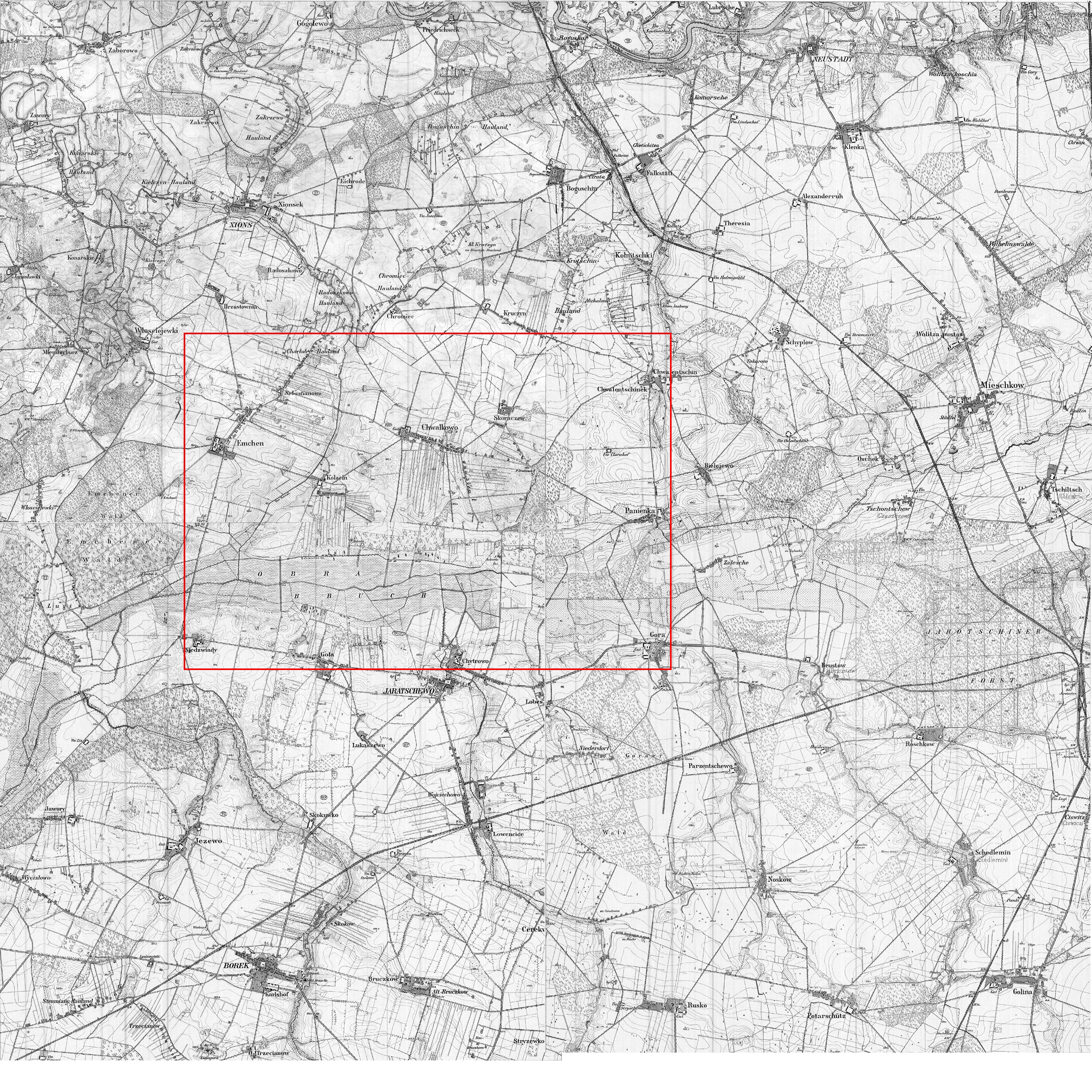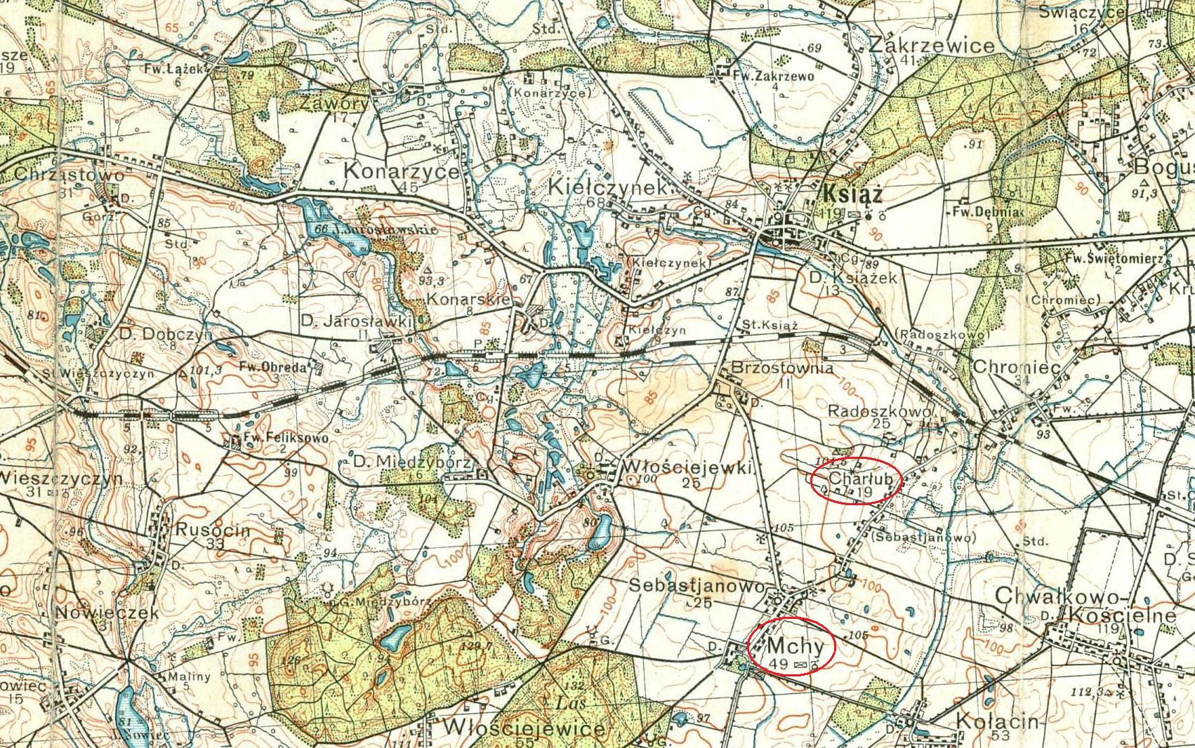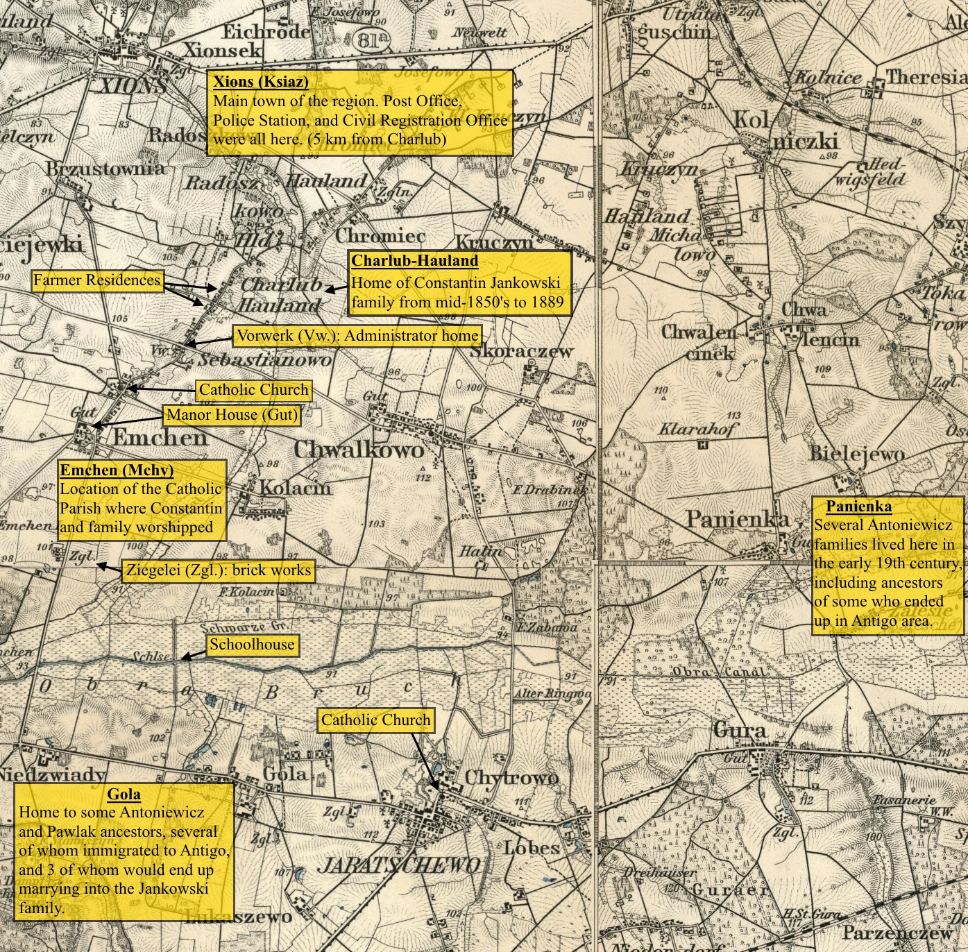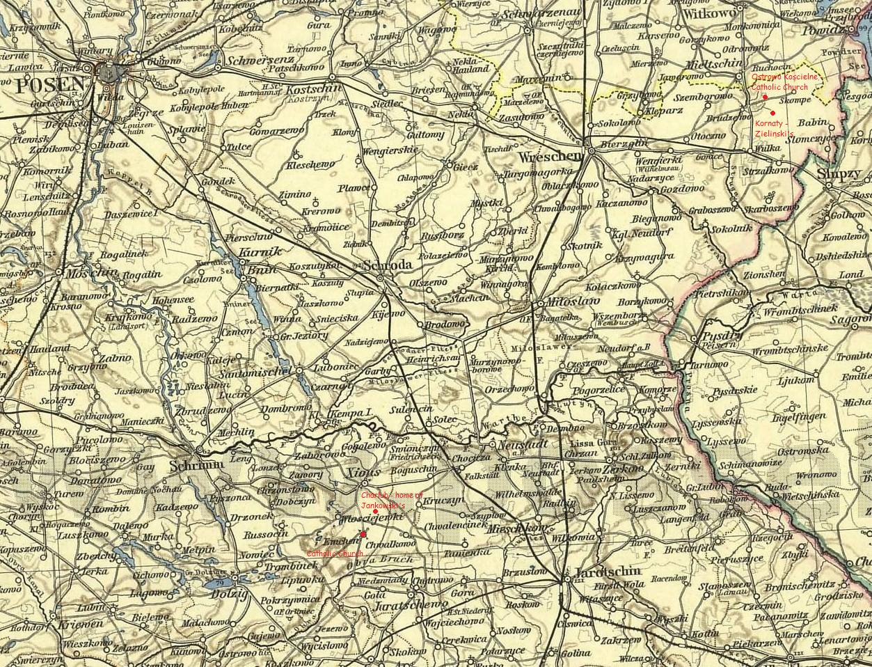 Mchy, also known by the German name of Emchen, is a village in the district of Srem. In 1889, 214 people inhabited the village in 19 houses. Of those 214 people, 204 were Catholic, 10 were Protestant, and 60 were unable to read or write! For the most part, these people were farmers.* By 1905, the town had grown to 387 residents, 384 of whom were Catholic.*Slownick Geograficzny published in 1889