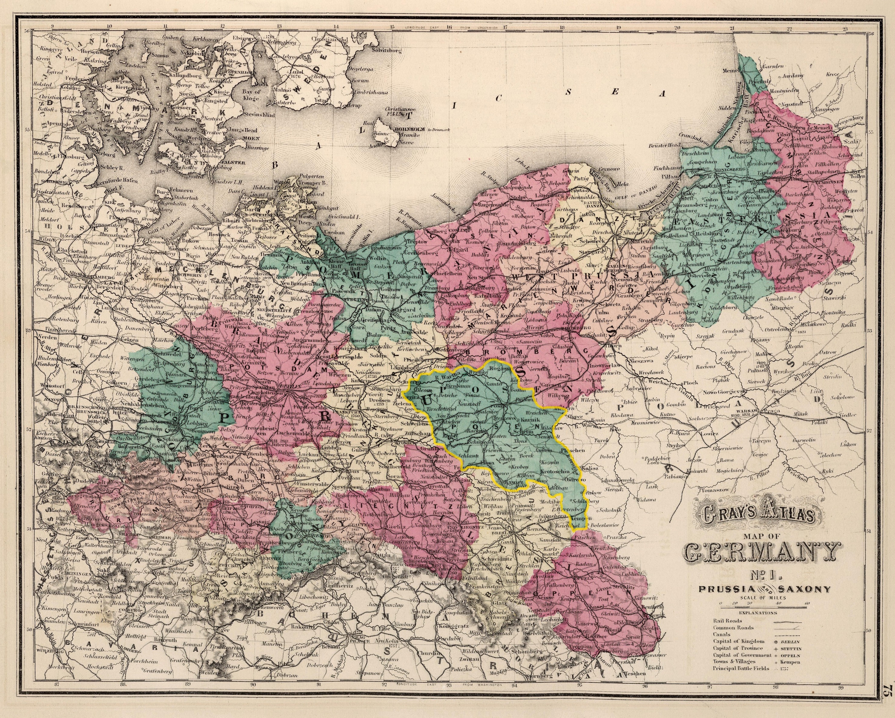 The Province of Posen was historically the heartland of the Polish state. However, in 1793, with the Second Partition of Poland, Posen became part of Prussia and would remain so until after Germany's defeat in World War I. It was during these years that the independent state of Poland ceased to exist. Below is a map of Prussia from 1873 showing the Province of Posen highlighted with a yellow border. All of our Jankowski ancestors originated from the province of Posen. The borders in the map below show what Posen looked like in the 1880's when the Jankowski's left Poland forever. In 1998, the province of Posen was incorporated into the newly formed province of Wielkopolskie, which is how you will find it on today's maps. For a brief history of the Province of Poland, click here.