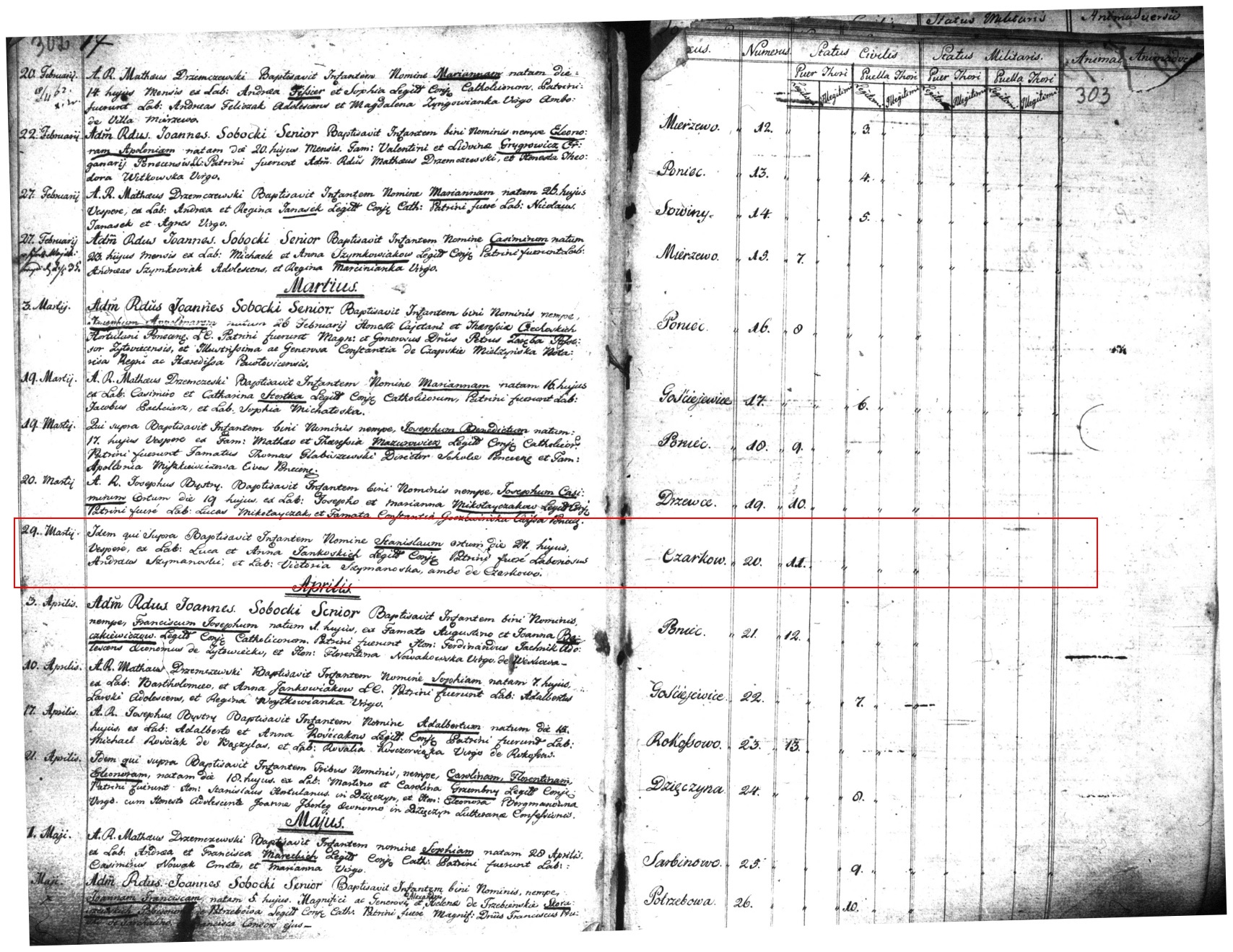 Record: 20th baptism for Poniec Parish in 1803, 11th male