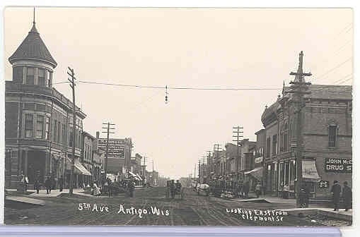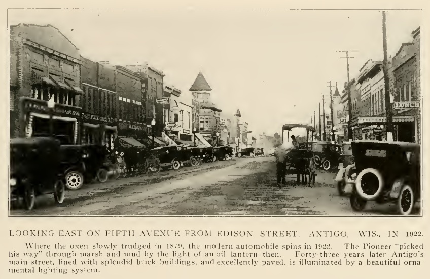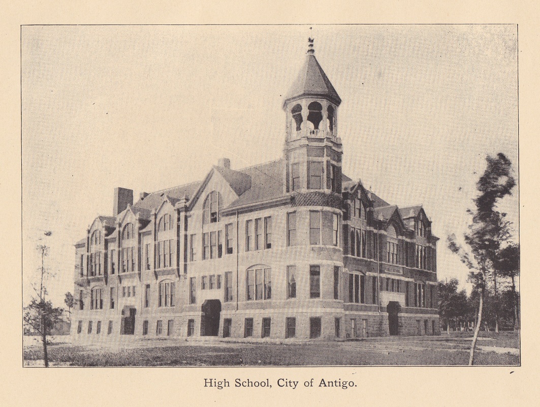 Antigo is the county seat of Langlade County. It was a planned community, founded in 1878 by Francis A. Deleglise, who initially named his town Springbrook. Later, he changed the name to Antigo, which comes from the Chippewa Indian name for the river that flows through the area, "Nequi-Antigo-sebi" meaning "spring river" or "evergreen".More pictures of early Antigo: