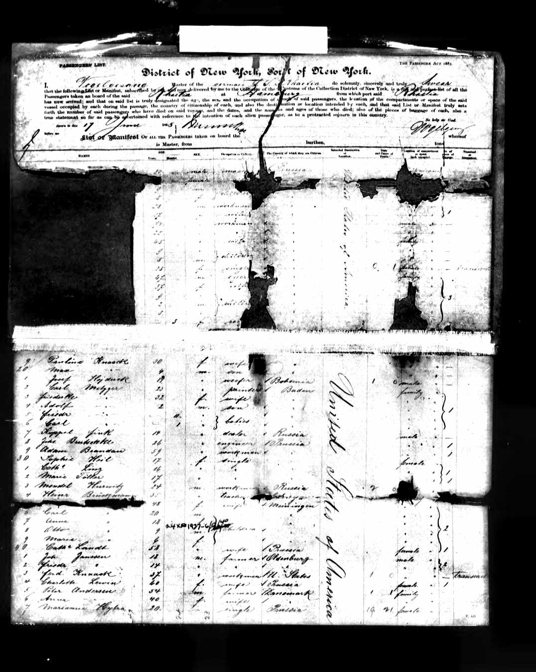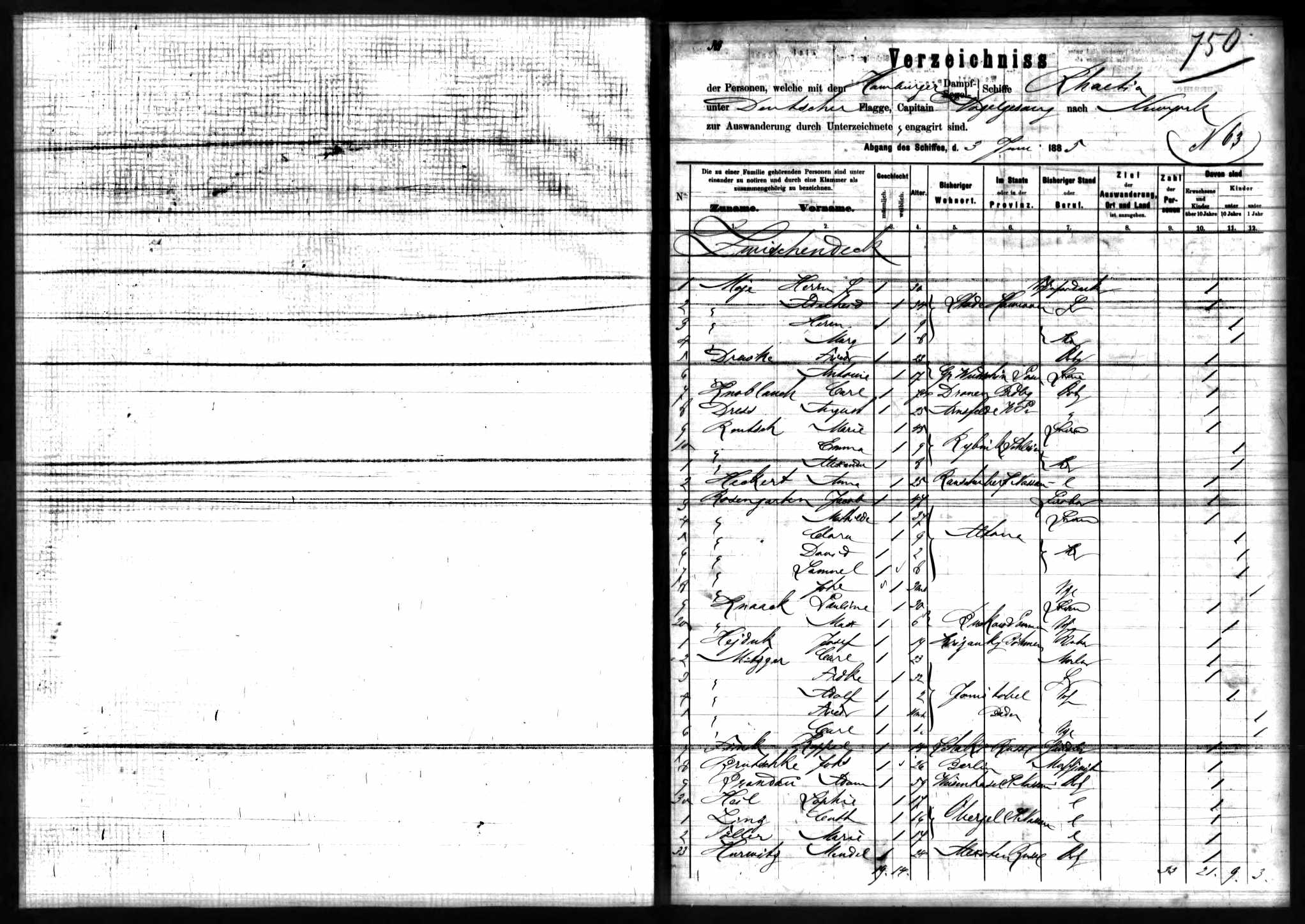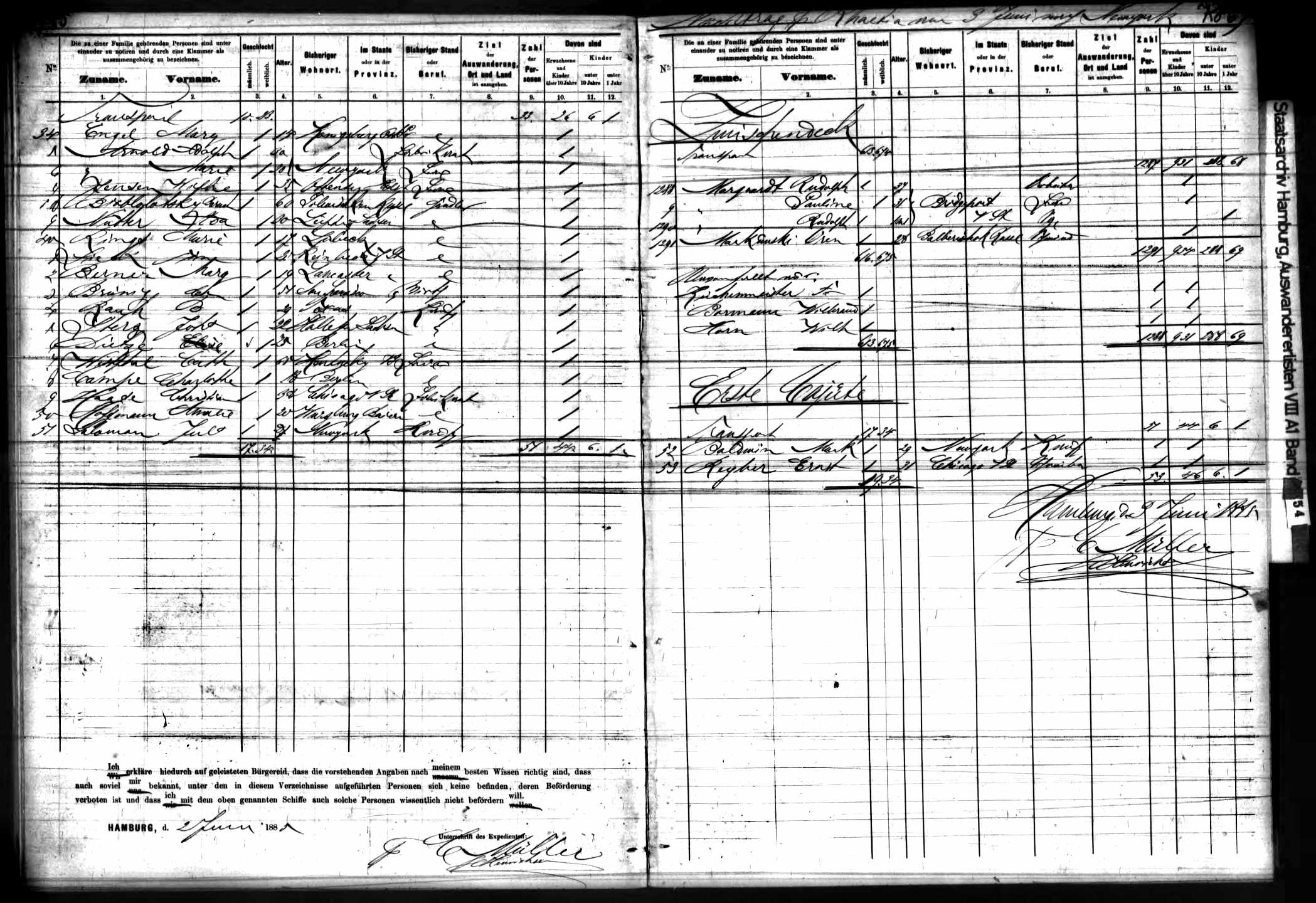 departure (Hamburg), and date of departure (June 3, 1885), along with the