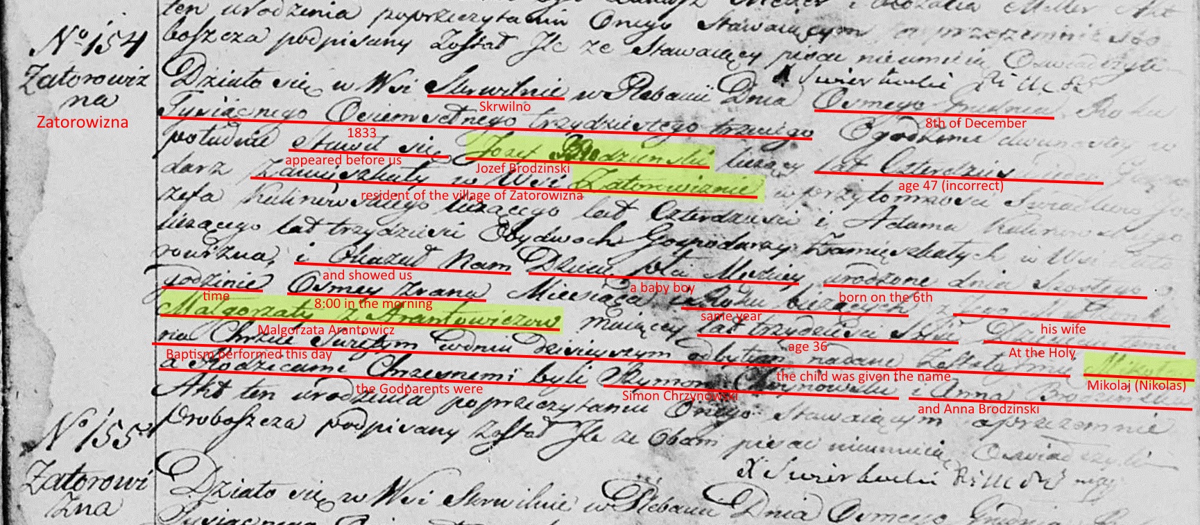 Nicholas Brodzinski, Lawrence's maternal grandfather, was born on December 1, 1833 in Zatorowizna, Poland, a small farming community about 4 miles from the Parish of Skrwilno. Nicholas was baptized in the Parish Church in Skrwilno. He was the 5th of 8 children born to Jozef Brodzinski and Malgorzata Arantowicz. He was the middle of 3 boys and had 5 sisters, one of whom (Katarzyna) died before Nicholas was born.