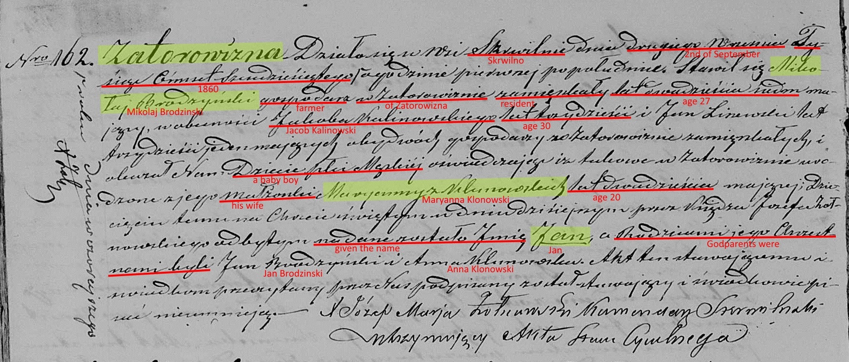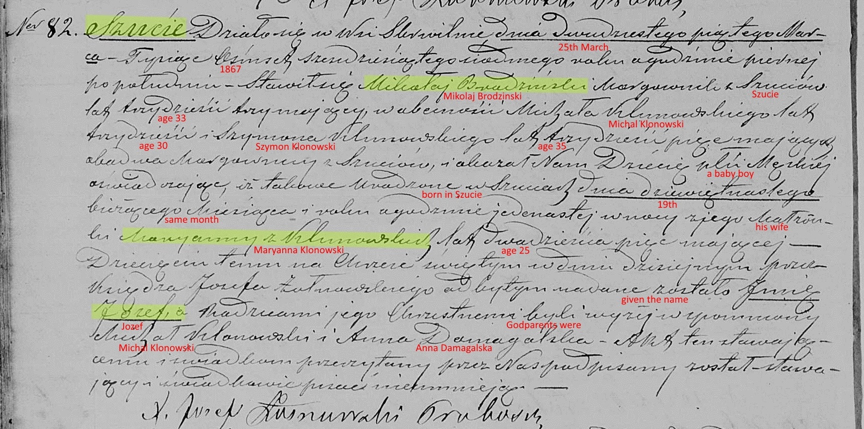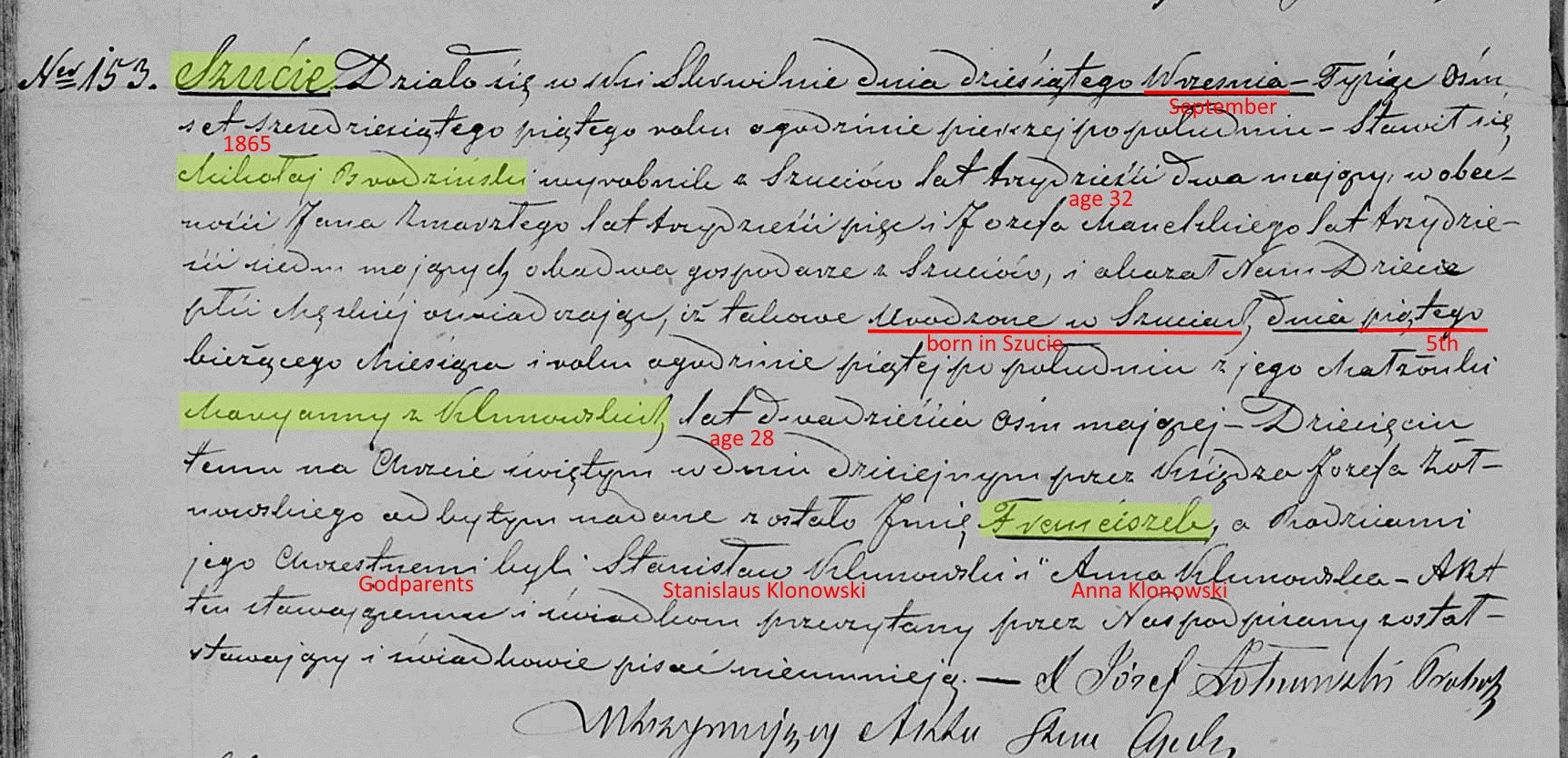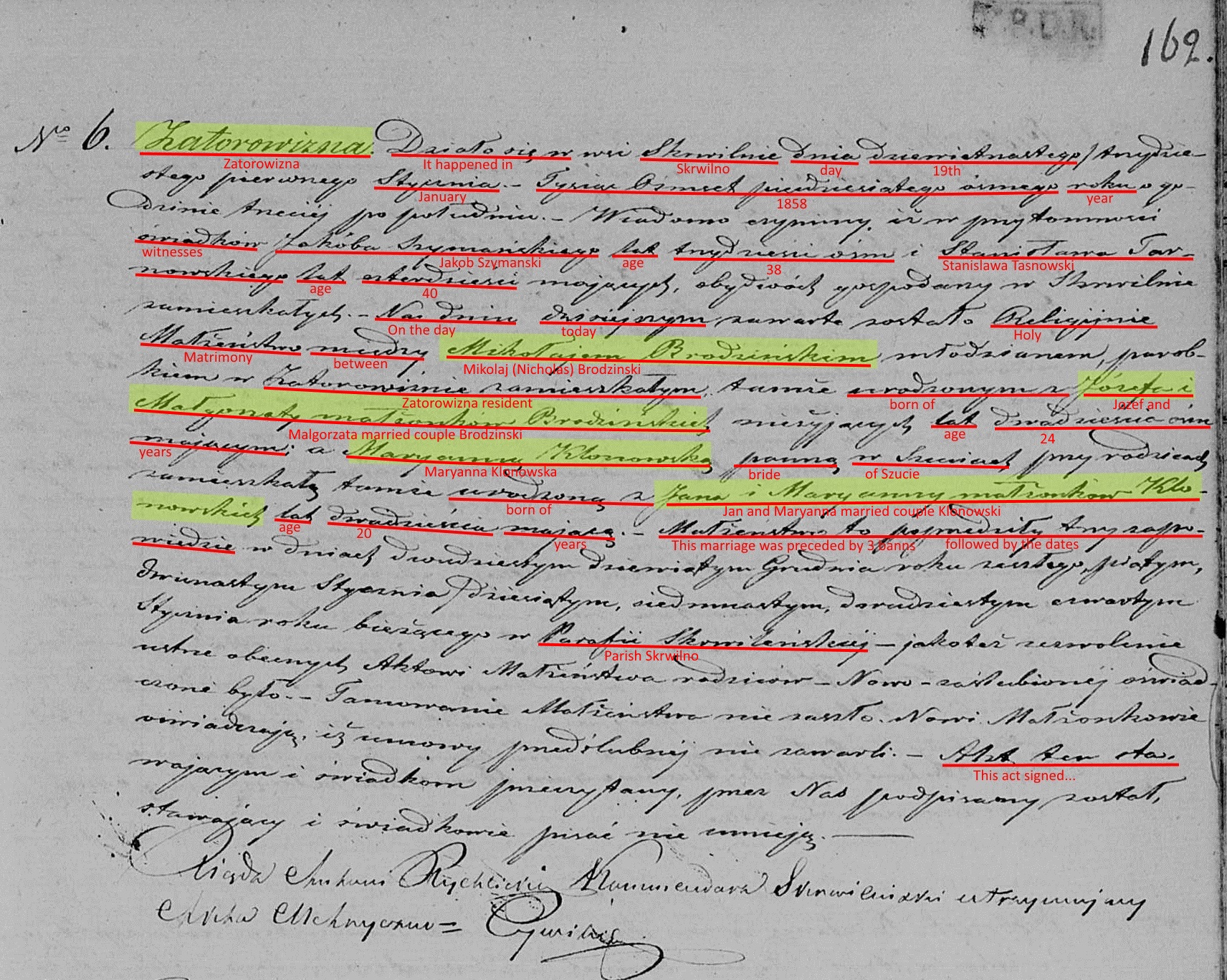 On January 19, 1858, at the age of 24, Nicholas married Maryanna "Marga" Klonowska, the 19 year old daughter of Jan and Maryanna Klonowski of Szucie. The marriage would've taken place in the parish church at Skrwilno, but the couple settled in Zatorowizna. One can only speculate how they might have met. However, both families attended the same church in Skrwilno making it likely they met there.