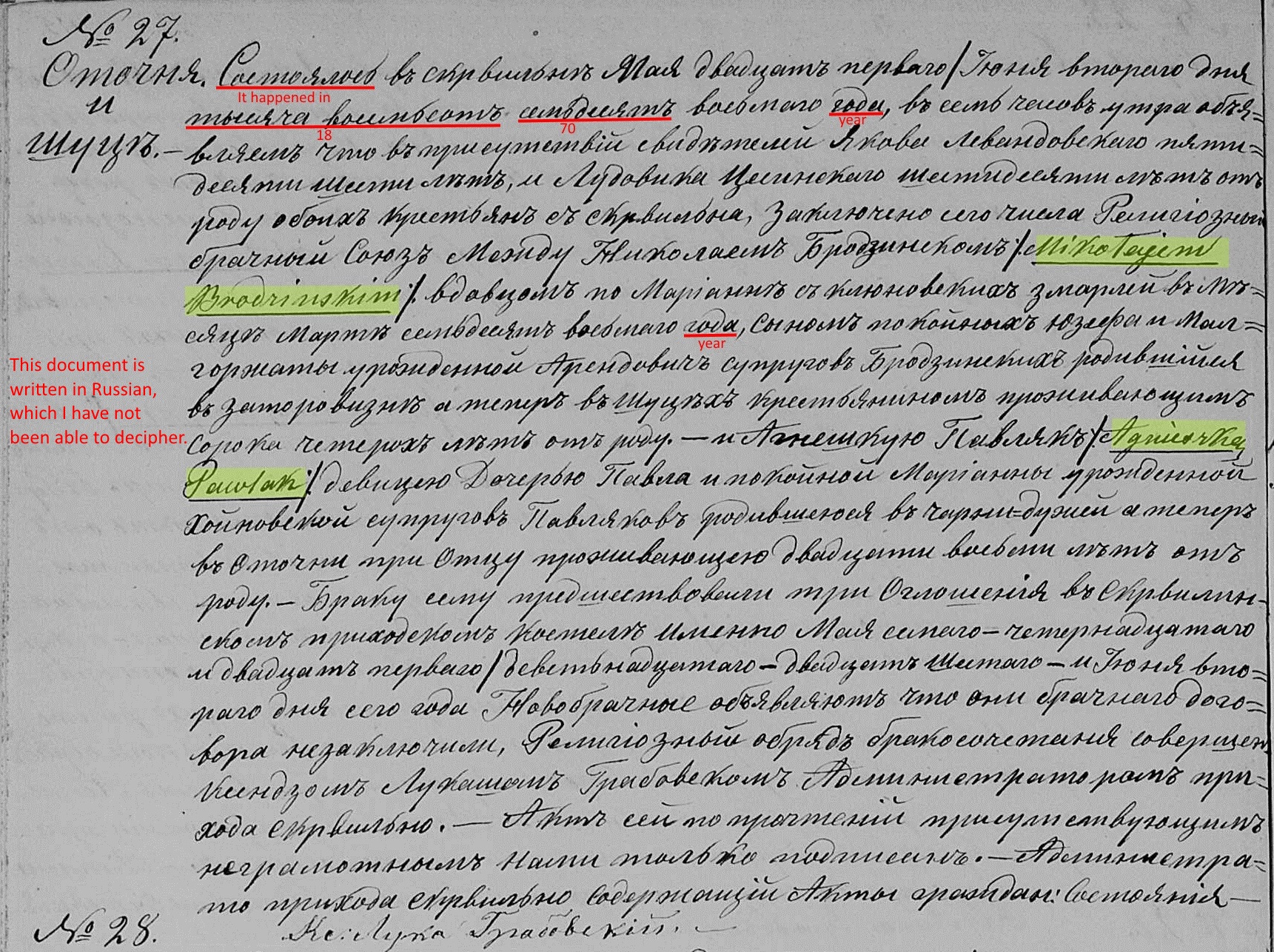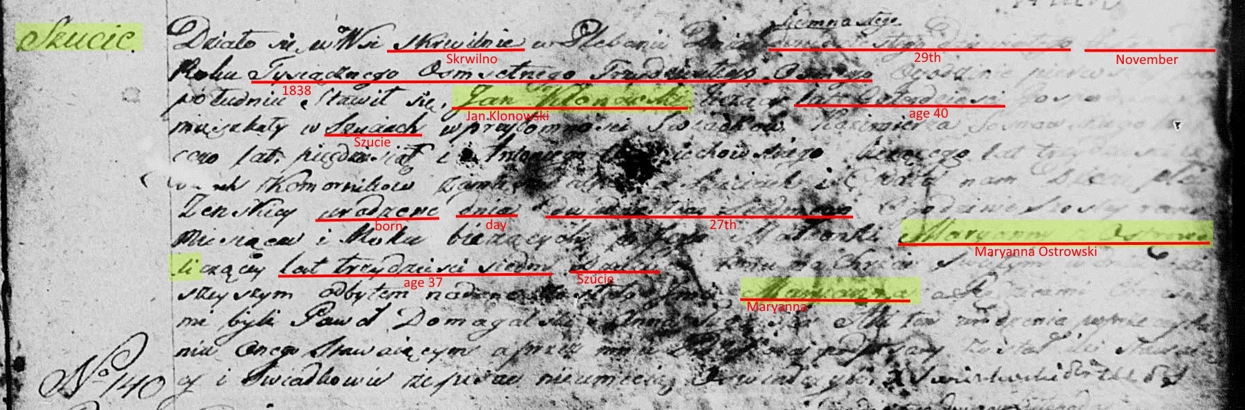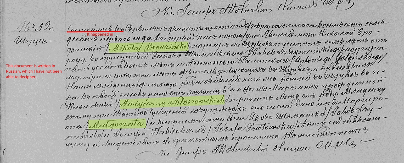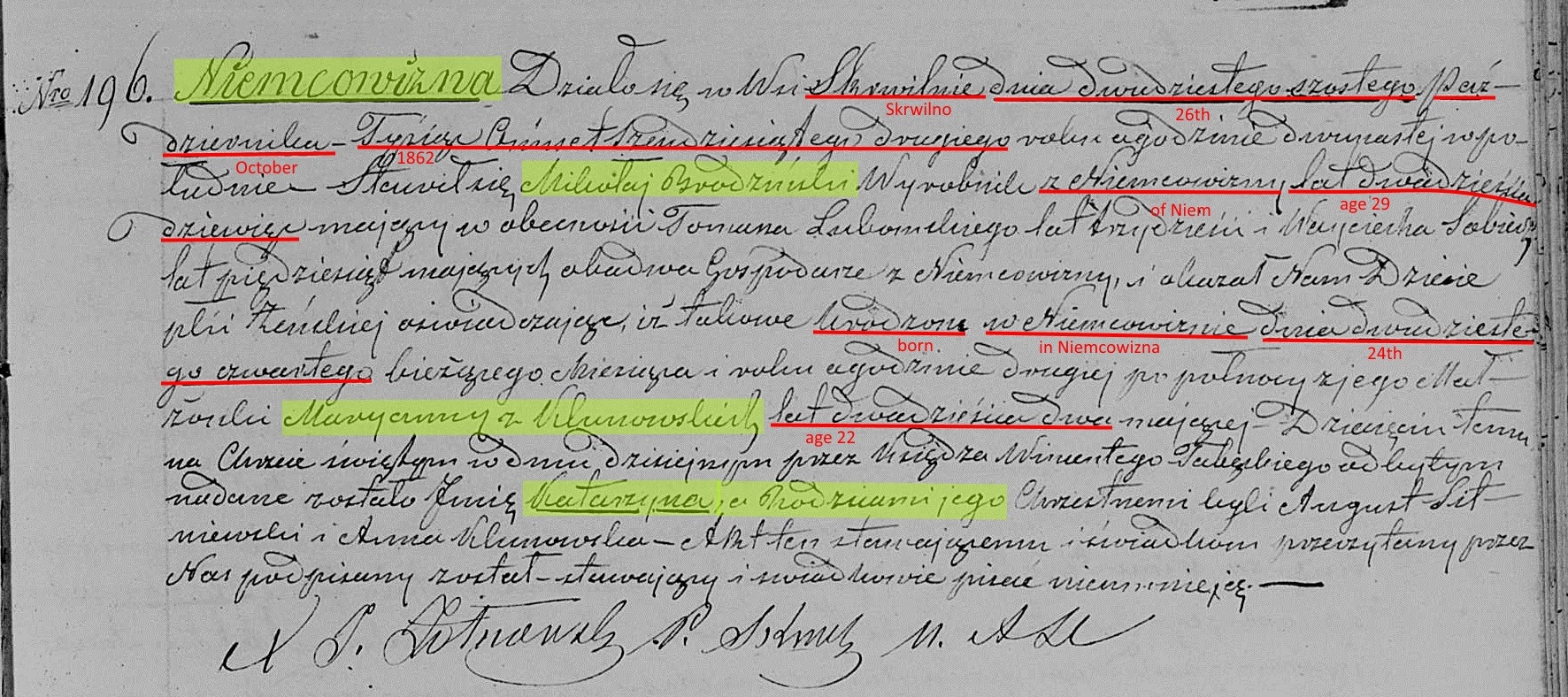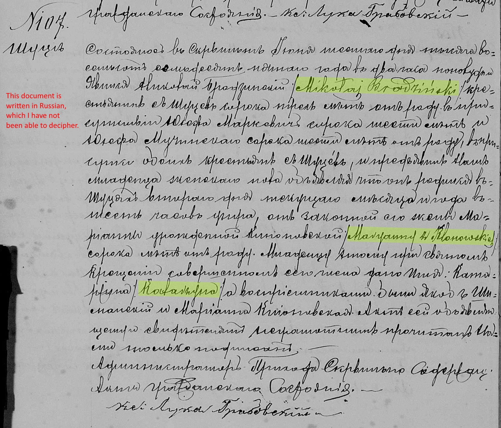 On January 19, 1858, at the age of 24, Nicholas married Maryanna "Marga" Klonowska, the 19 year old daughter of Jan and Maryanna Klonowski of Szucie. The marriage would've taken place in the parish church at Skrwilno, but the couple settled in Zatorowizna. One can only speculate how they might have met. However, both families attended the same church in Skrwilno making it likely they met there.