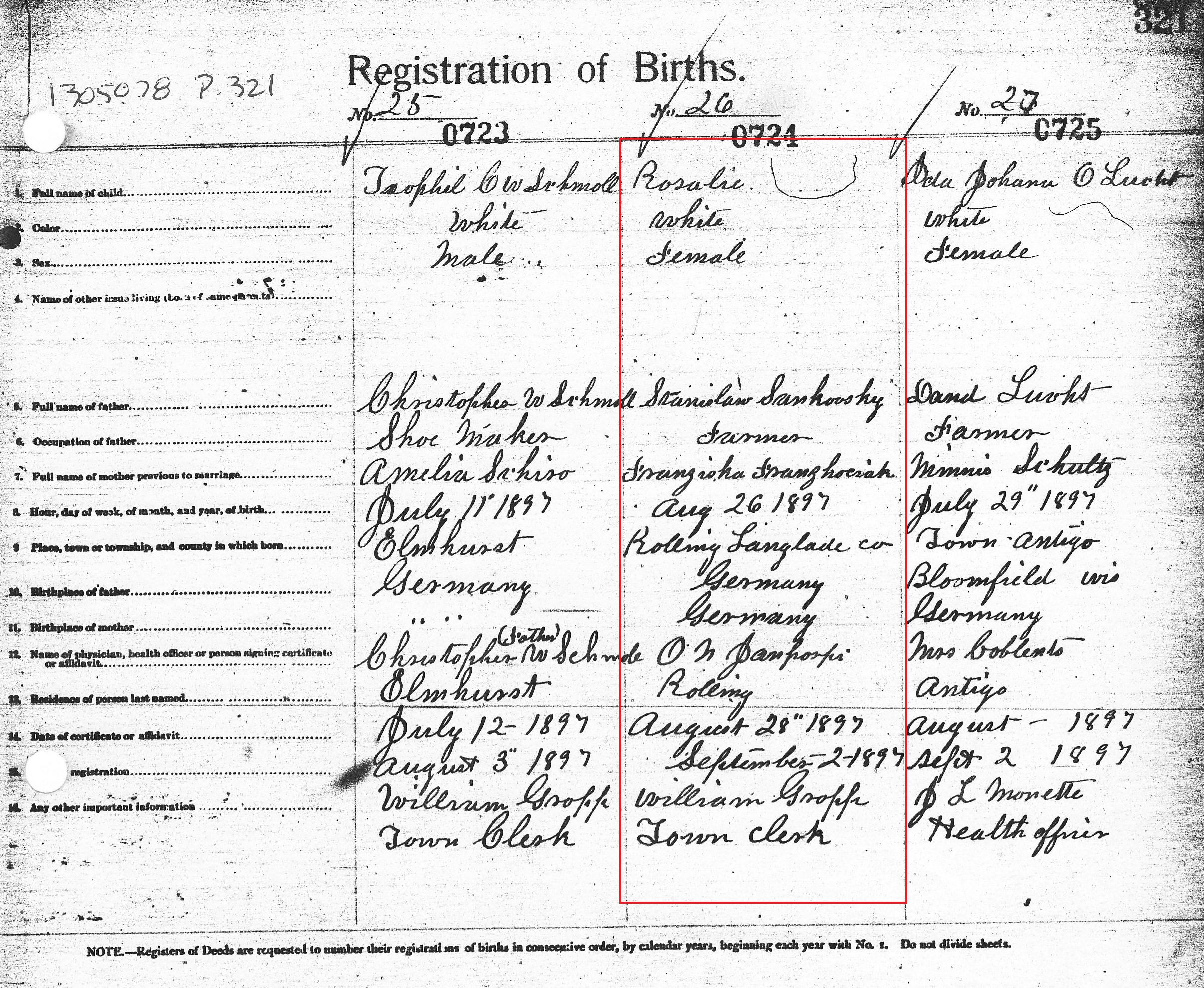 Two of the couple's children, Mary and John, were born in Poland. Katie and Rosa were both born in Rolling, Wisconsin - Katie in 1892 and Rosa in 1897. I have found no other documents indicating additional children.